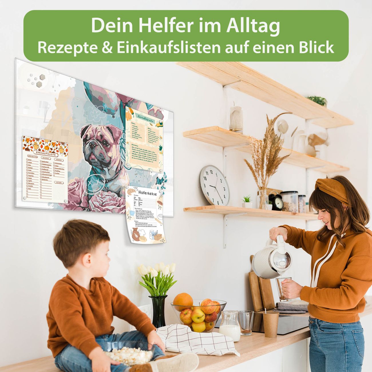 Auf der glatten Glasoberfläche lassen sich Termine, Rezepte oder Notizen ganz einfach mit Kreidestiften festhalten und rückstandslos entfernen. Starke Neodym-Magnete halten Ihre wichtigsten Erinnerungen sicher an Ort und Stelle. So entsteht Ihre ganz persönliche Ideenwand - jeden Tag neu.