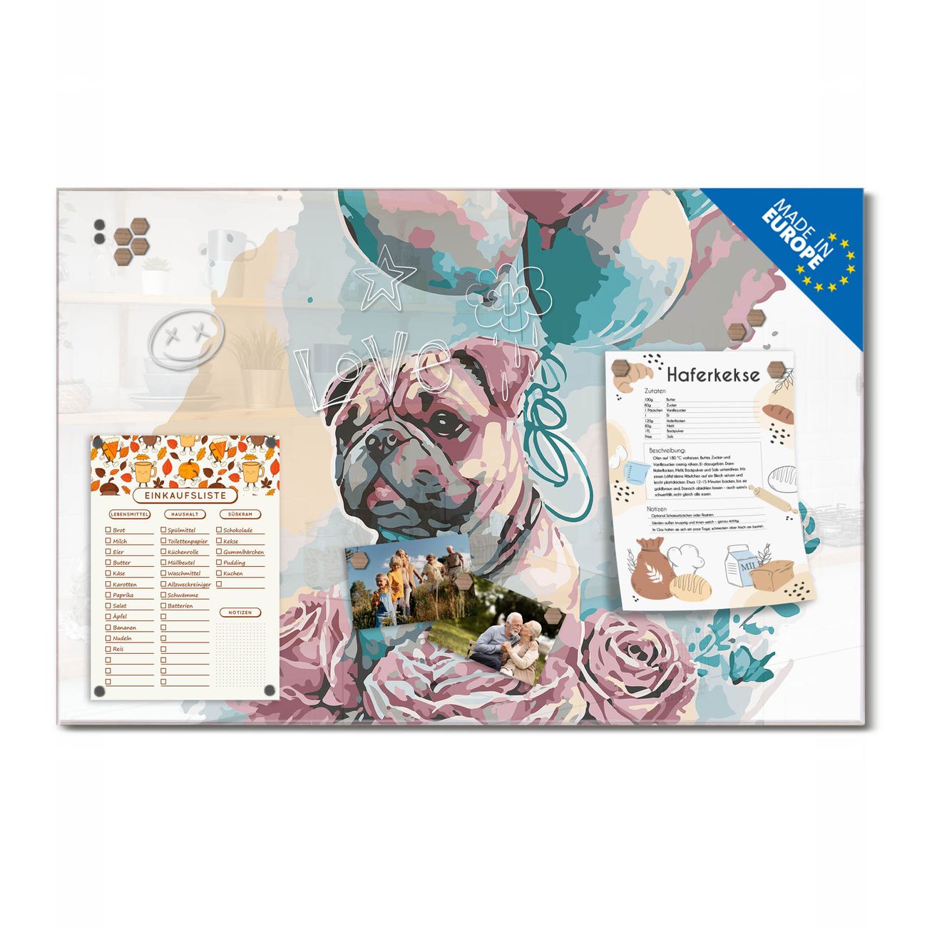 Ein Stück Design, das Ihren Alltag organisiert. Schreiben, heften, inspirieren - alles an einem Ort. Qualität, die man spürt. Montage leicht gemacht. Handwerk mit Herz - veredelt in Sachsen. Einzigartiges Design mit Motiv Motiv Pudeliges Blumenglück Beschreibbare Glasoberfläche, leicht zu reinigen Starke Magnetkraft durch Stahlrückwand Inklusive 4 Neodym-Magneten Flexible Montageoptionen Handveredelt in Sachsen - Qualität, die bleibt