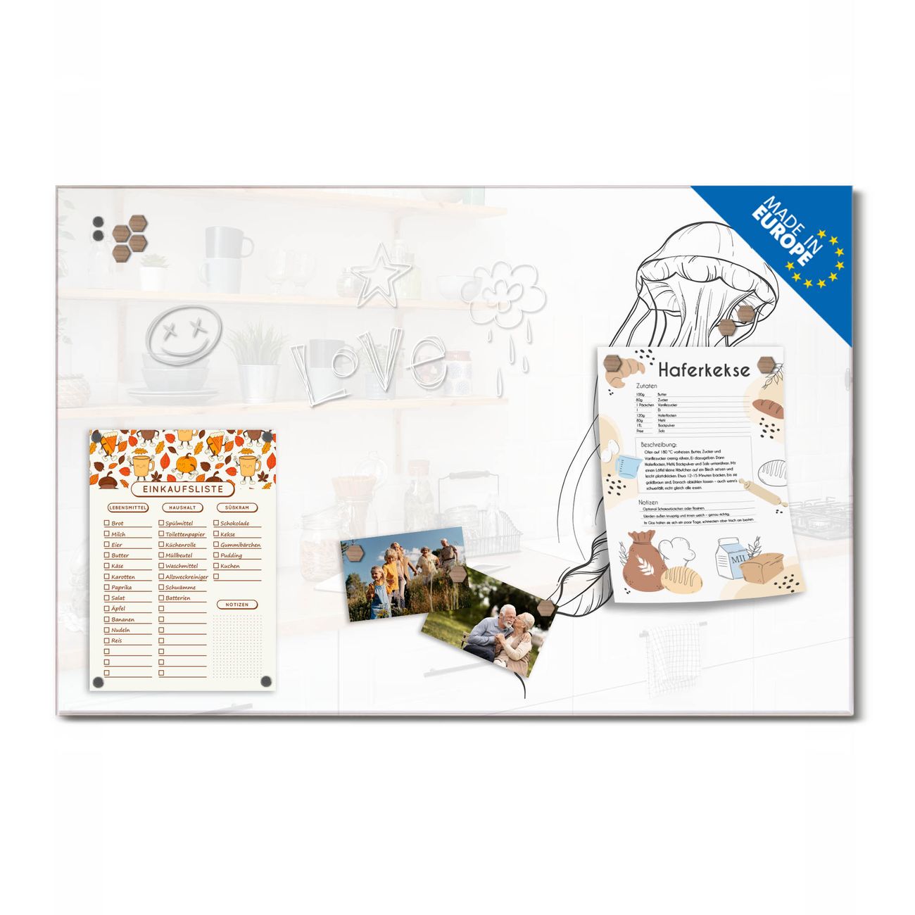 Auf der glatten Glasoberfläche lassen sich Termine, Rezepte oder Notizen ganz einfach mit Kreidestiften festhalten und rückstandslos entfernen. Starke Neodym-Magnete halten Ihre wichtigsten Erinnerungen sicher an Ort und Stelle. So entsteht Ihre ganz persönliche Ideenwand - jeden Tag neu.