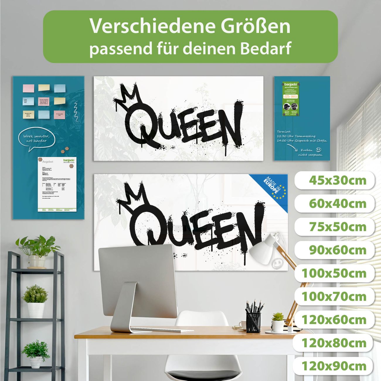 Ein Stück Design, das Ihren Alltag organisiert. Schreiben, heften, inspirieren - alles an einem Ort. Qualität, die man spürt. Montage leicht gemacht. Handwerk mit Herz - veredelt in Sachsen. Einzigartiges Design mit Motiv Motiv Queen Graffiti Beschreibbare Glasoberfläche, leicht zu reinigen Starke Magnetkraft durch Stahlrückwand Inklusive 4 Neodym-Magneten Flexible Montageoptionen Handveredelt in Sachsen - Qualität, die bleibt