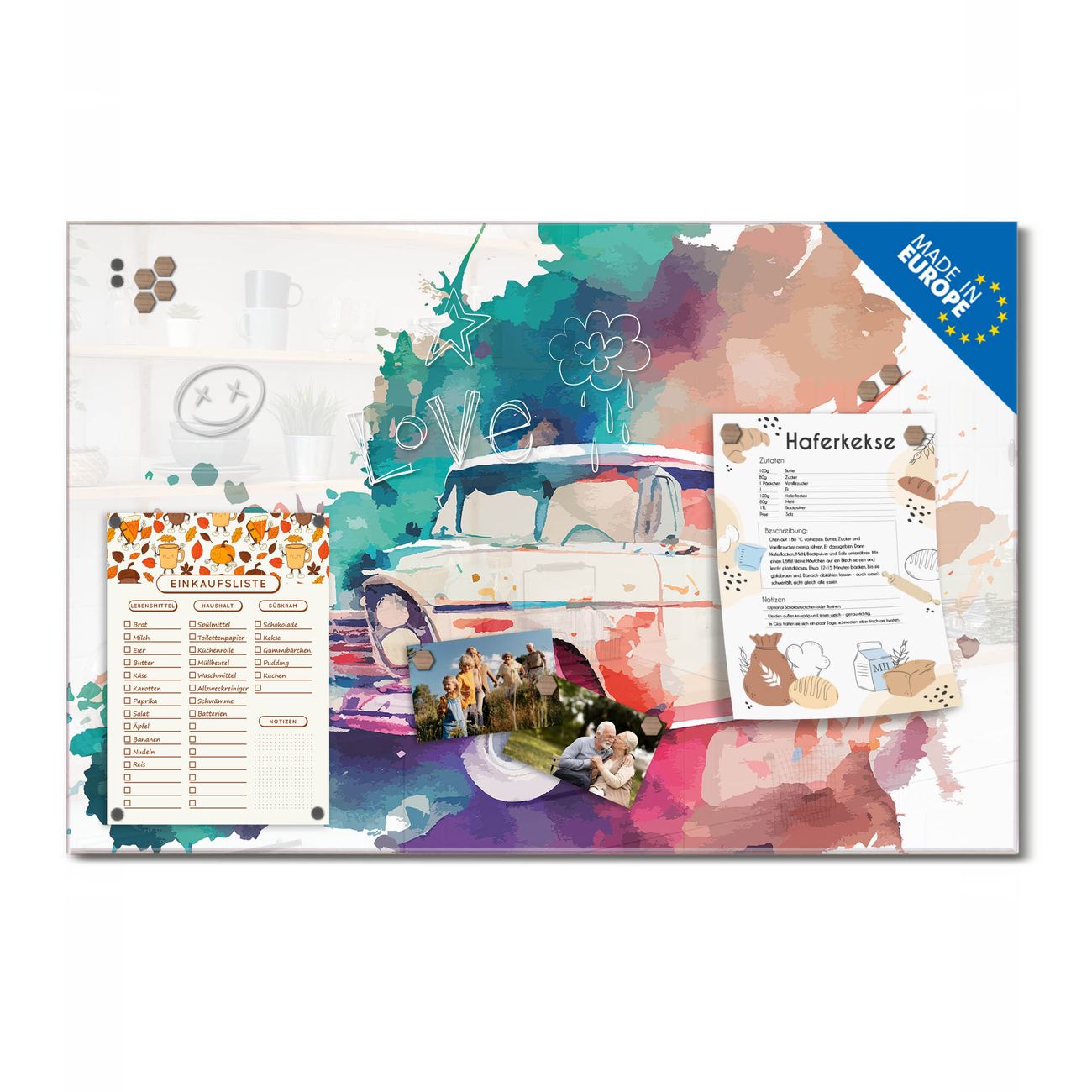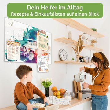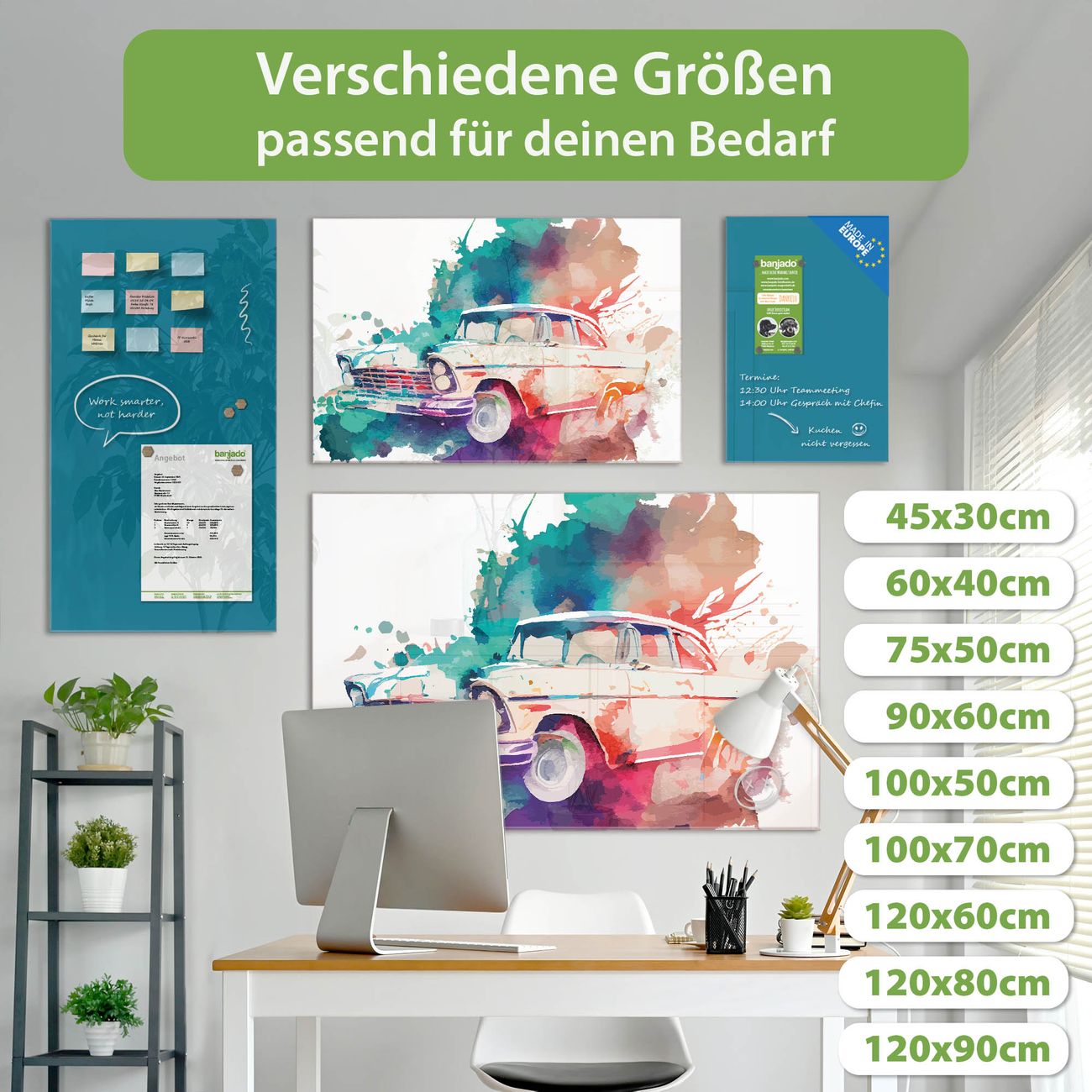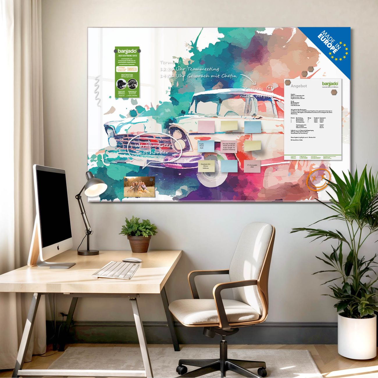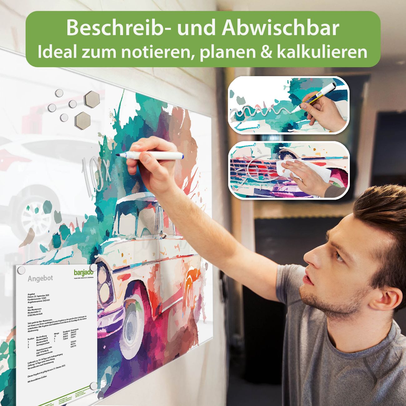 Die banjado Glas Magnettafel mit dem Motiv Motiv Retro-Auto in Aquarell verbindet Funktionalität mit Stil. Sie ersetzt das Zettelchaos durch klare Strukturen und bringt dabei eine warme, natürliche Atmosphäre in Ihr Zuhause. Ob im Büro, in der Küche oder im Eingangsbereich - dieses Design-Board zieht Blicke an und sorgt für Ordnung mit Charakter.
