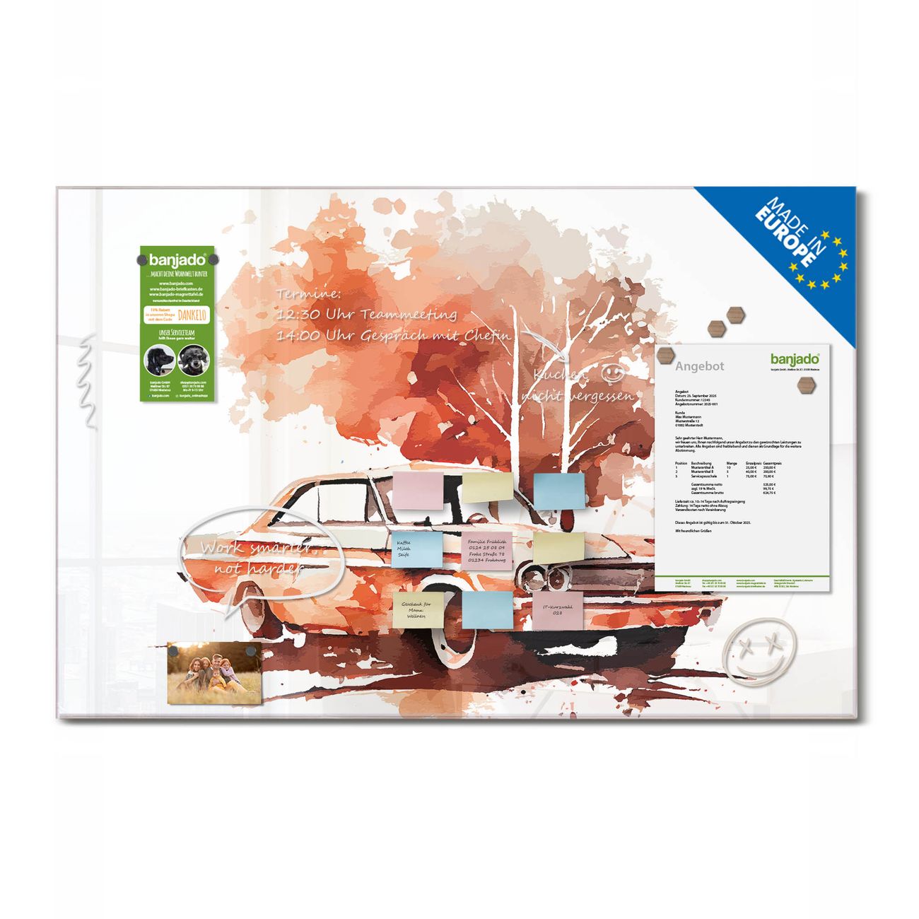 Jede Glas Magnettafel wird in unserer Werkstatt von Hand gefertigt und sorgfältig geprüft. So erhalten Sie ein echtes Qualitätsprodukt, das Funktion und Ästhetik perfekt vereint.?? Warum banjado?