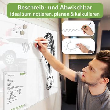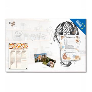 Auf der glatten Glasoberfläche lassen sich Termine, Rezepte oder Notizen ganz einfach mit Kreidestiften festhalten und rückstandslos entfernen. Starke Neodym-Magnete halten Ihre wichtigsten Erinnerungen sicher an Ort und Stelle. So entsteht Ihre ganz persönliche Ideenwand - jeden Tag neu.