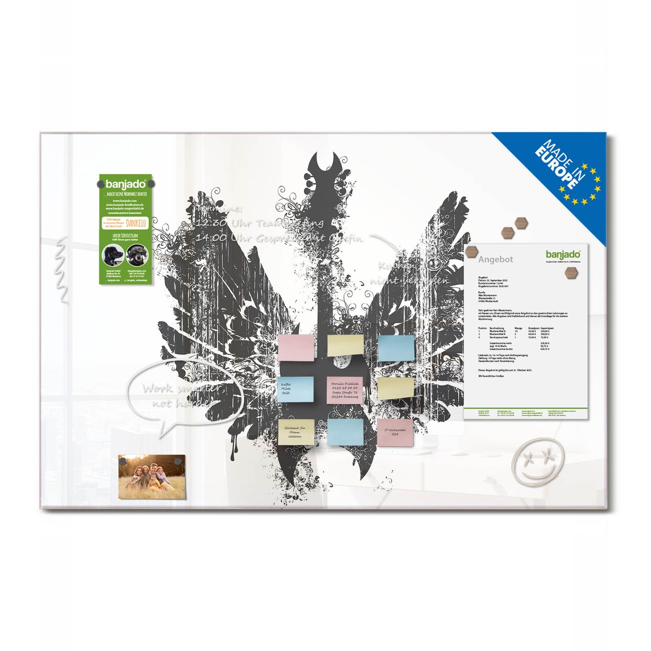 Jede Glas Magnettafel wird in unserer Werkstatt von Hand gefertigt und sorgfältig geprüft. So erhalten Sie ein echtes Qualitätsprodukt, das Funktion und Ästhetik perfekt vereint.?? Warum banjado?