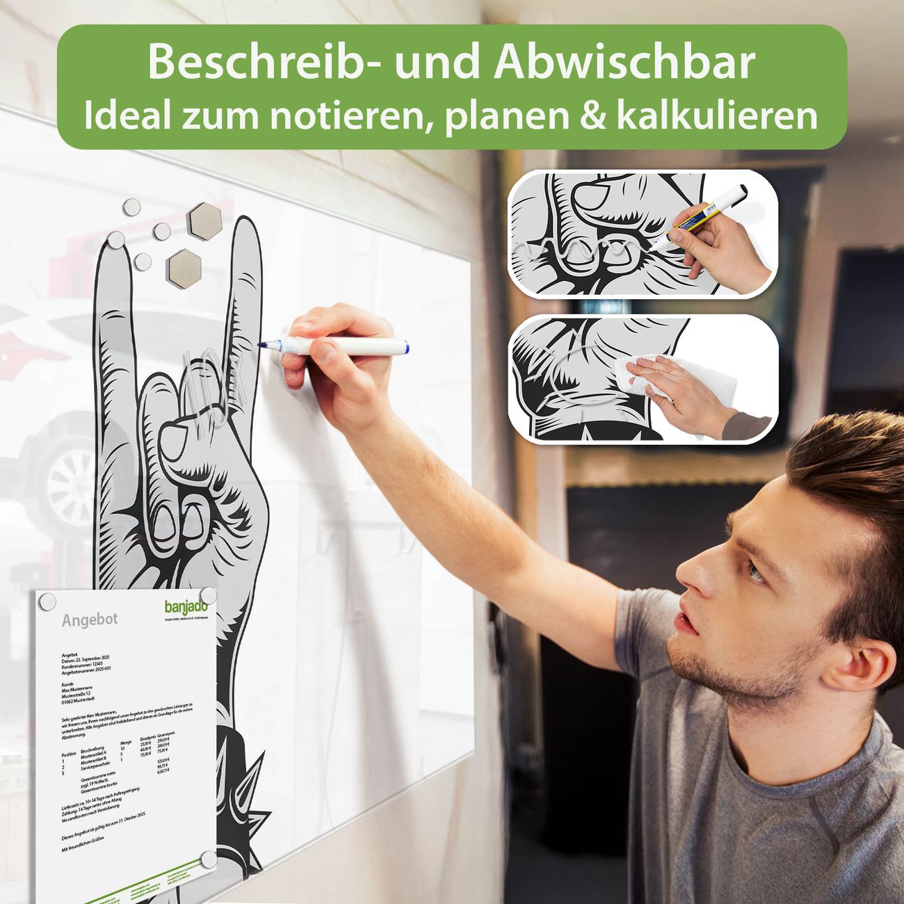 Jede Glas Magnettafel wird in unserer Werkstatt von Hand gefertigt und sorgfältig geprüft. So erhalten Sie ein echtes Qualitätsprodukt, das Funktion und Ästhetik perfekt vereint.?? Warum banjado?