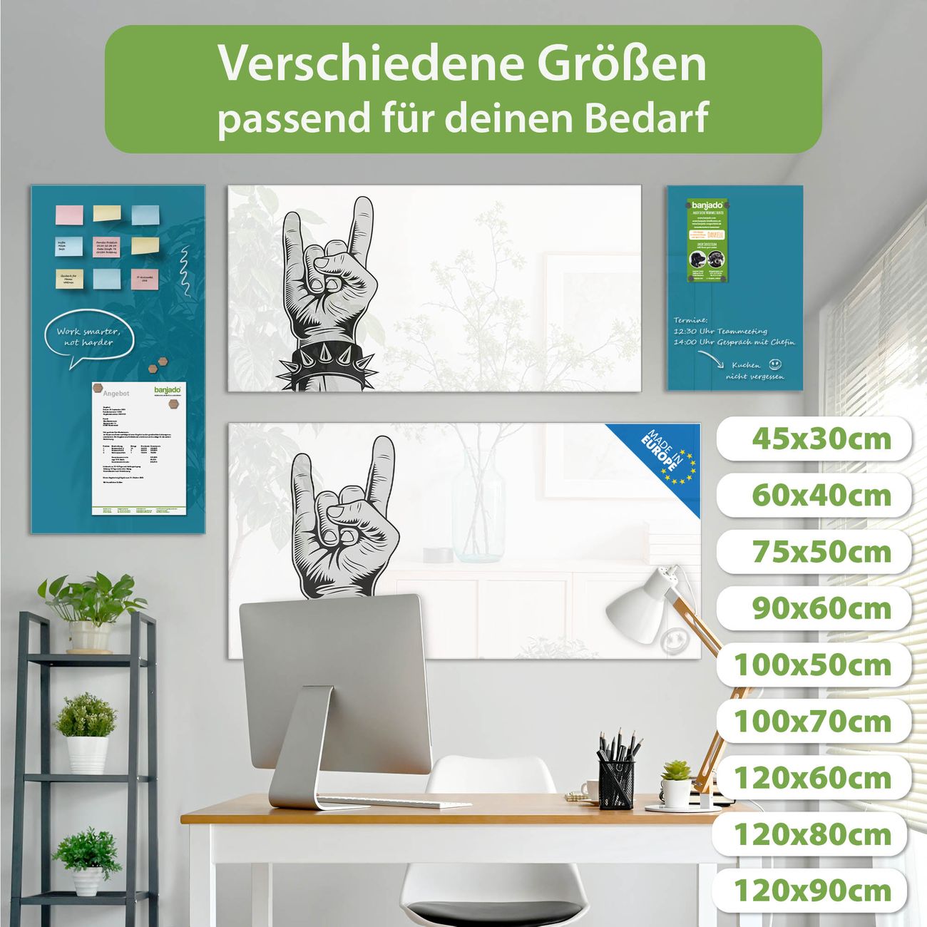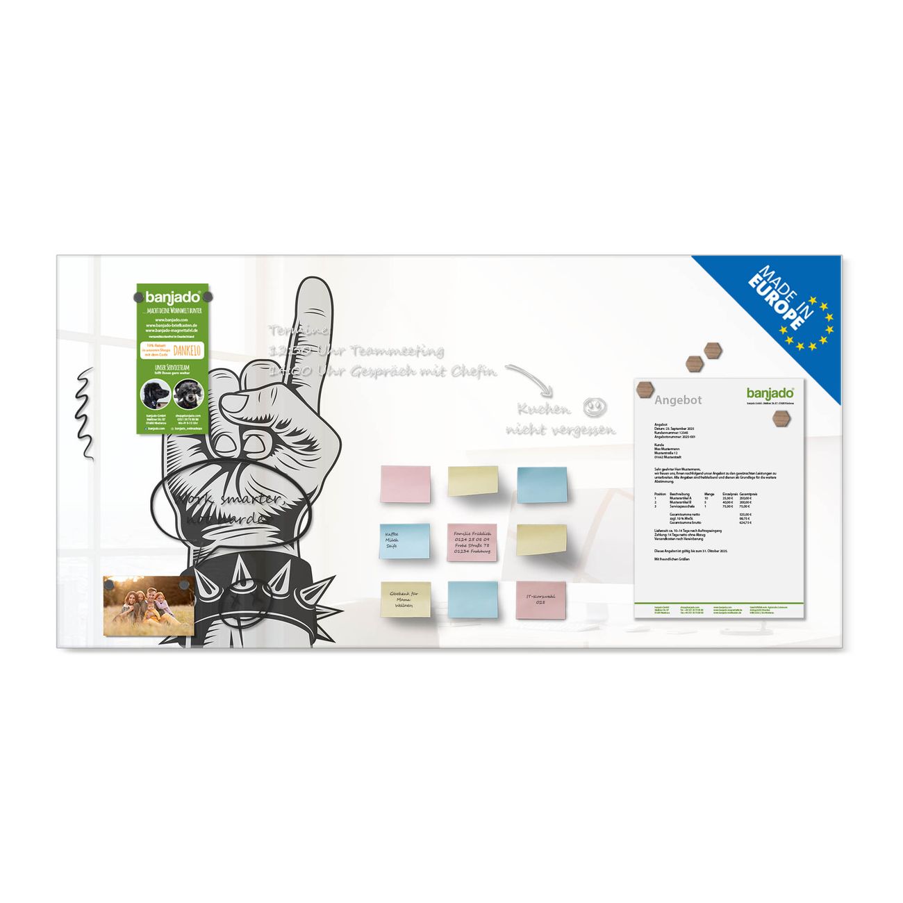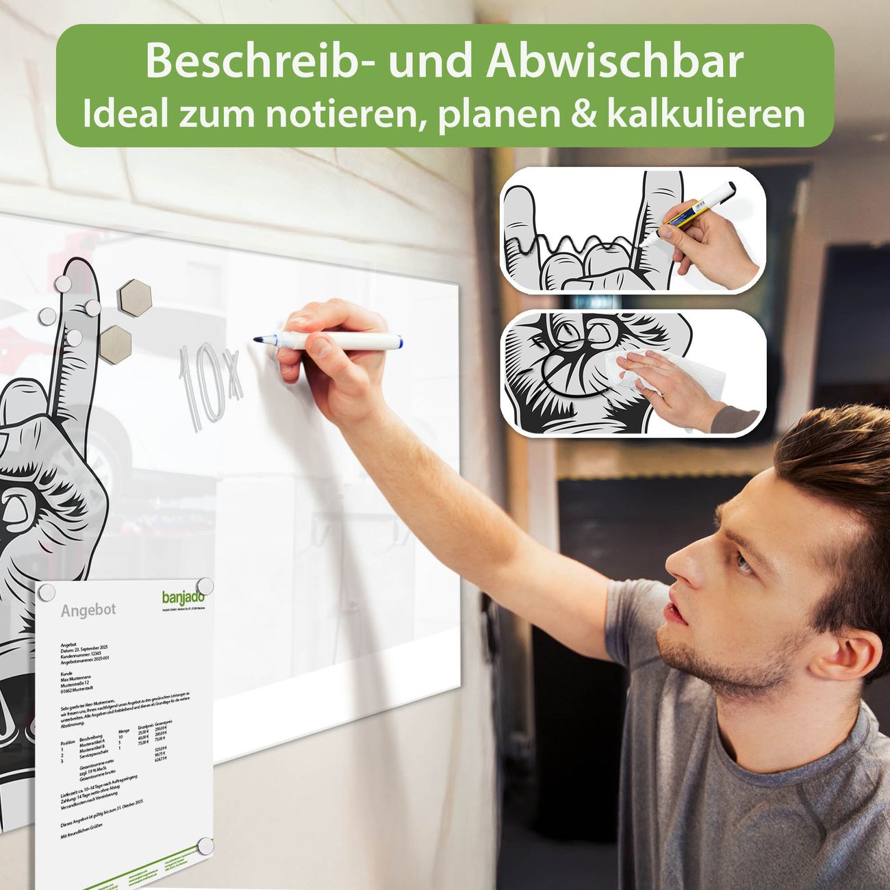 Jede Glas Magnettafel wird in unserer Werkstatt von Hand gefertigt und sorgfältig geprüft. So erhalten Sie ein echtes Qualitätsprodukt, das Funktion und Ästhetik perfekt vereint.?? Warum banjado?