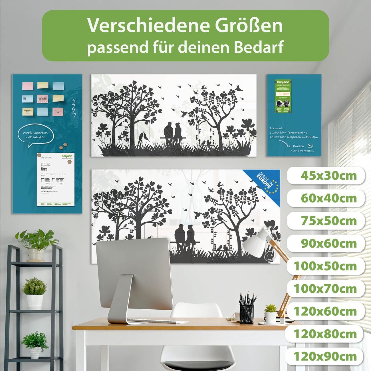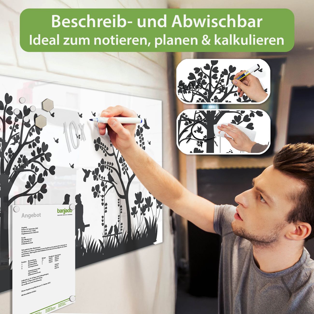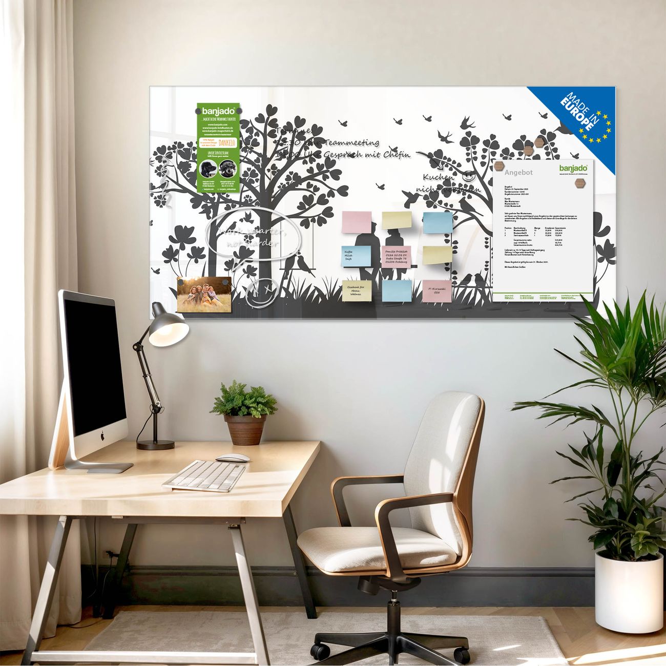 Jede Glas Magnettafel wird in unserer Werkstatt von Hand gefertigt und sorgfältig geprüft. So erhalten Sie ein echtes Qualitätsprodukt, das Funktion und Ästhetik perfekt vereint.?? Warum banjado?