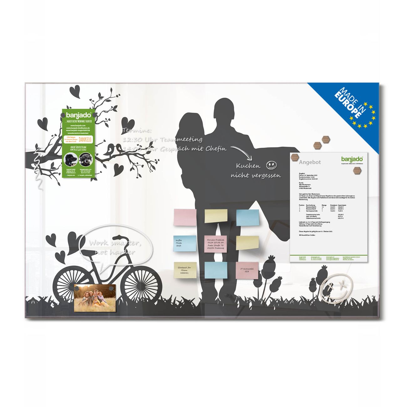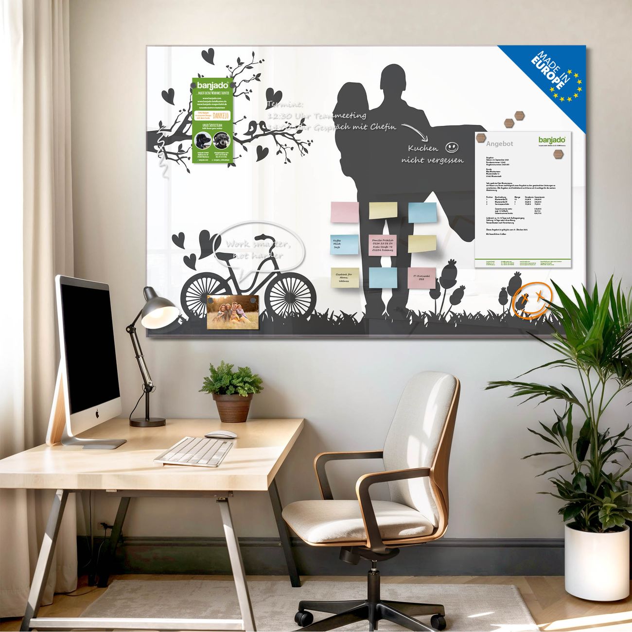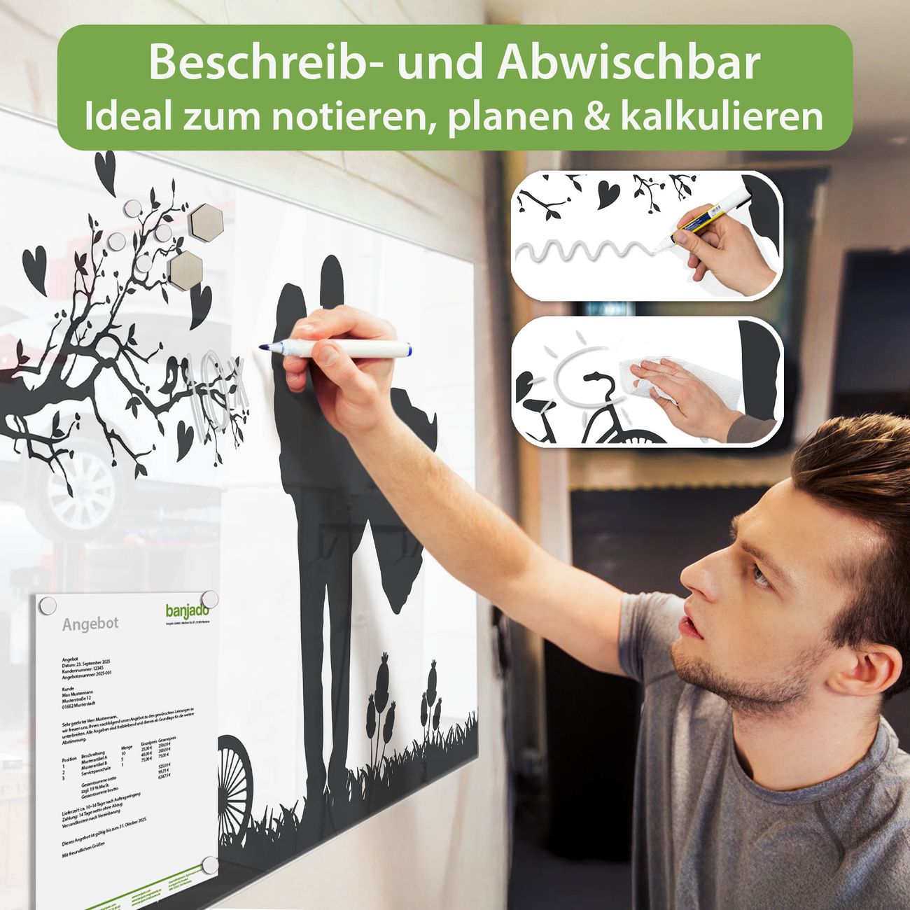 Jede Glas Magnettafel wird in unserer Werkstatt von Hand gefertigt und sorgfältig geprüft. So erhalten Sie ein echtes Qualitätsprodukt, das Funktion und Ästhetik perfekt vereint.?? Warum banjado?