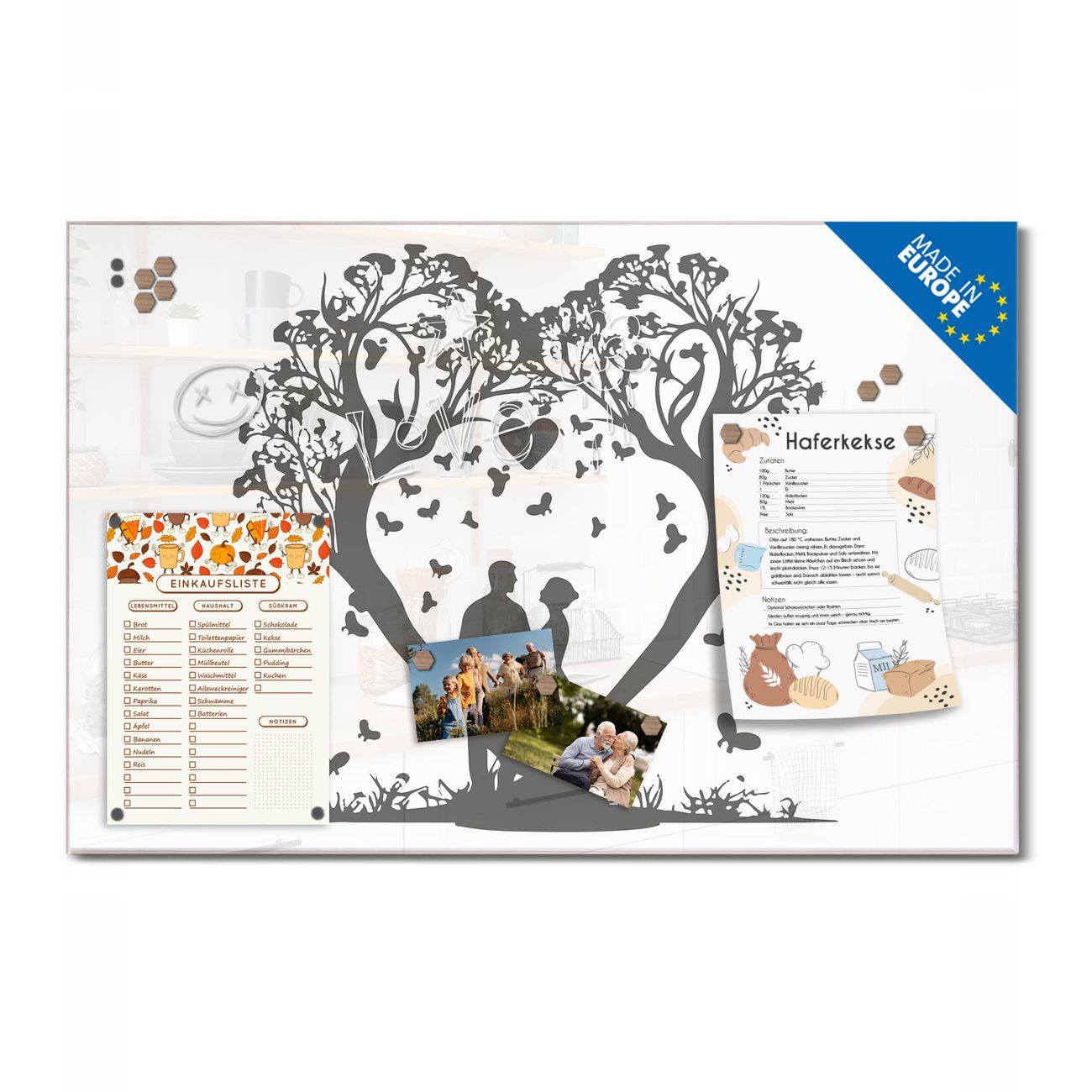 Ein Stück Design, das Ihren Alltag organisiert. Schreiben, heften, inspirieren - alles an einem Ort. Qualität, die man spürt. Montage leicht gemacht. Handwerk mit Herz - veredelt in Sachsen. Einzigartiges Design mit Motiv Motiv Romantisches Baumherz Beschreibbare Glasoberfläche, leicht zu reinigen Starke Magnetkraft durch Stahlrückwand Inklusive 4 Neodym-Magneten Flexible Montageoptionen Handveredelt in Sachsen - Qualität, die bleibt