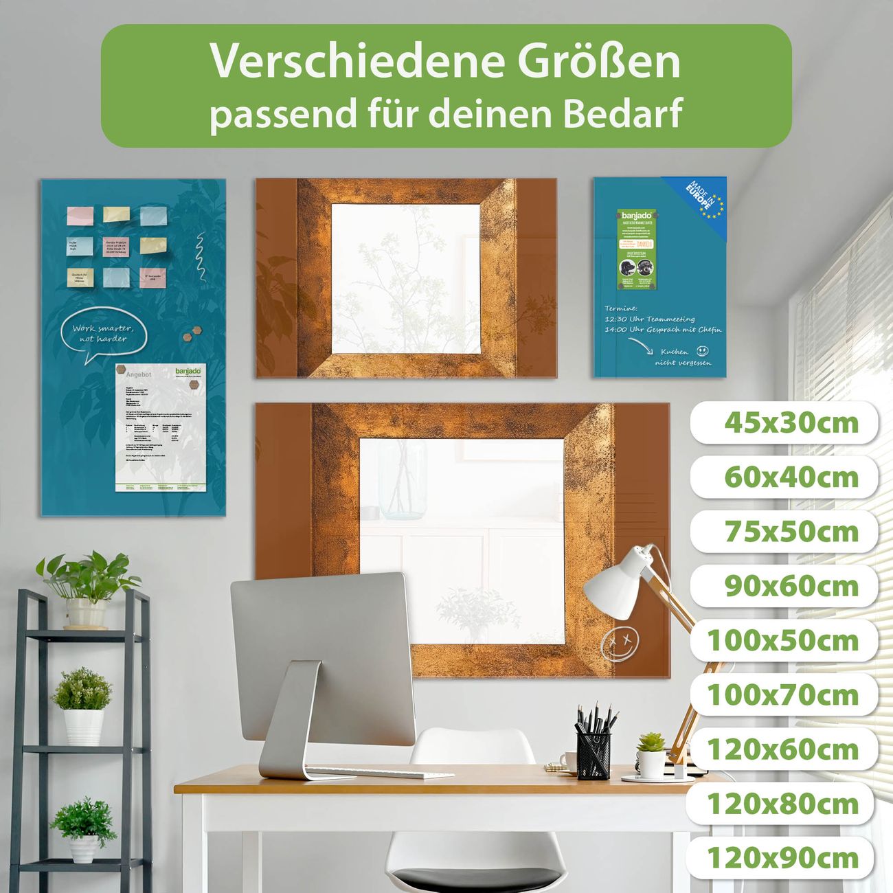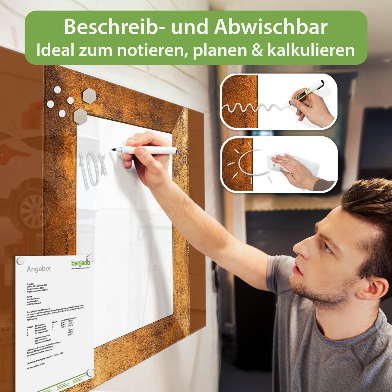 Jede Glas Magnettafel wird in unserer Werkstatt von Hand gefertigt und sorgfältig geprüft. So erhalten Sie ein echtes Qualitätsprodukt, das Funktion und Ästhetik perfekt vereint.?? Warum banjado?