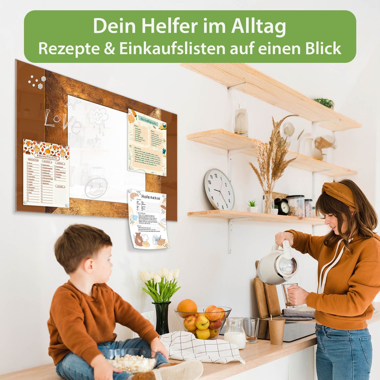 Auf der glatten Glasoberfläche lassen sich Termine, Rezepte oder Notizen ganz einfach mit Kreidestiften festhalten und rückstandslos entfernen. Starke Neodym-Magnete halten Ihre wichtigsten Erinnerungen sicher an Ort und Stelle. So entsteht Ihre ganz persönliche Ideenwand - jeden Tag neu.