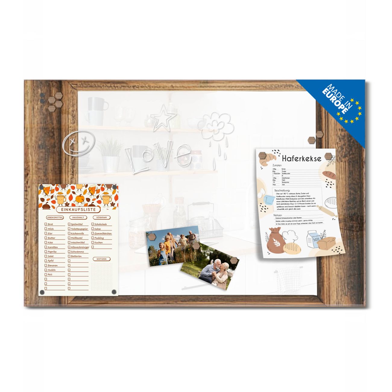 Ein Stück Design, das Ihren Alltag organisiert. Schreiben, heften, inspirieren - alles an einem Ort. Qualität, die man spürt. Montage leicht gemacht. Handwerk mit Herz - veredelt in Sachsen. Einzigartiges Design mit Motiv Motiv Rustikaler Holzrahmen Beschreibbare Glasoberfläche, leicht zu reinigen Starke Magnetkraft durch Stahlrückwand Inklusive 4 Neodym-Magneten Flexible Montageoptionen Handveredelt in Sachsen - Qualität, die bleibt