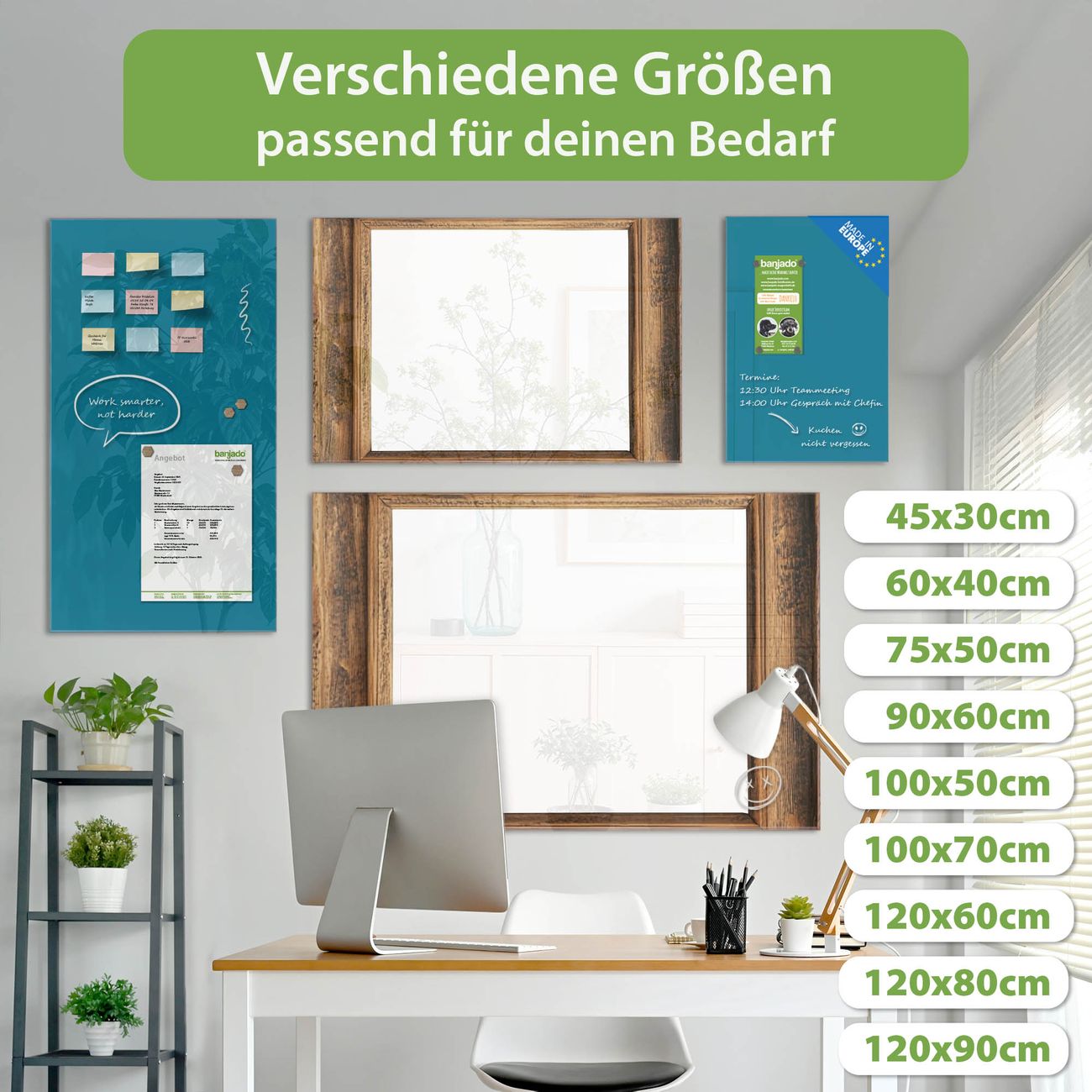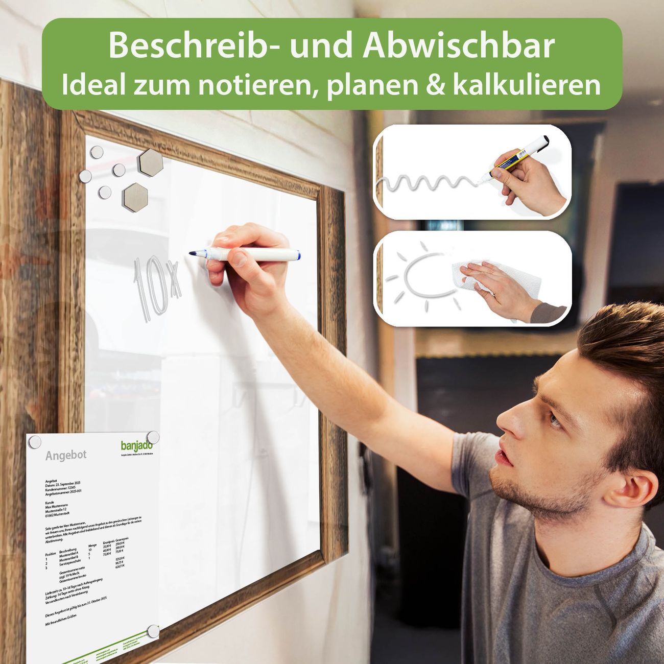 Jede Glas Magnettafel wird in unserer Werkstatt von Hand gefertigt und sorgfältig geprüft. So erhalten Sie ein echtes Qualitätsprodukt, das Funktion und Ästhetik perfekt vereint.?? Warum banjado?