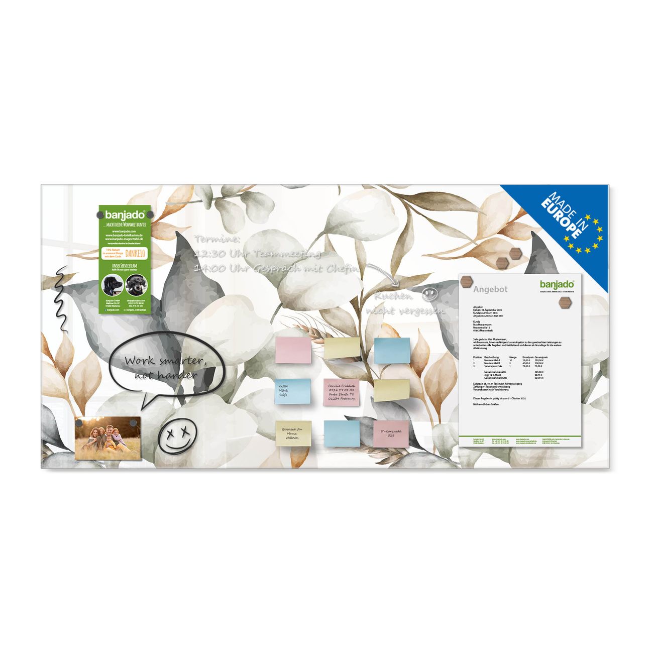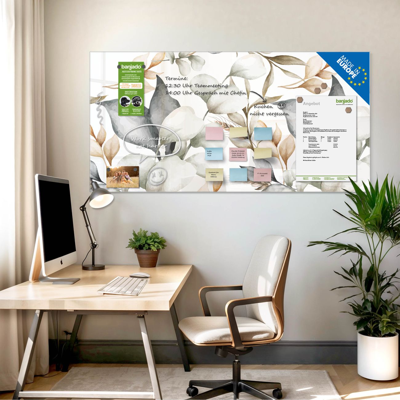 Jede Glas Magnettafel wird in unserer Werkstatt von Hand gefertigt und sorgfältig geprüft. So erhalten Sie ein echtes Qualitätsprodukt, das Funktion und Ästhetik perfekt vereint.?? Warum banjado?