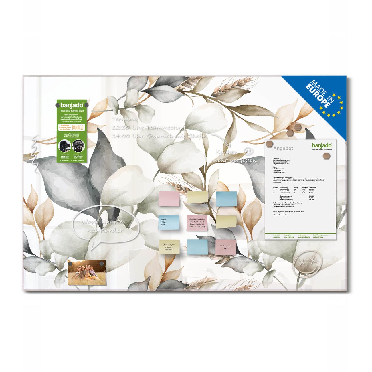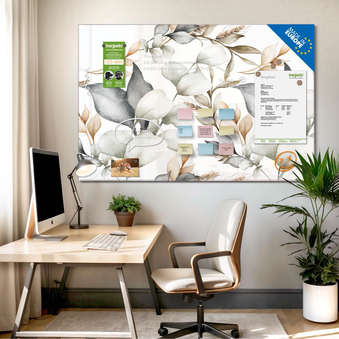 Jede Glas Magnettafel wird in unserer Werkstatt von Hand gefertigt und sorgfältig geprüft. So erhalten Sie ein echtes Qualitätsprodukt, das Funktion und Ästhetik perfekt vereint.?? Warum banjado?