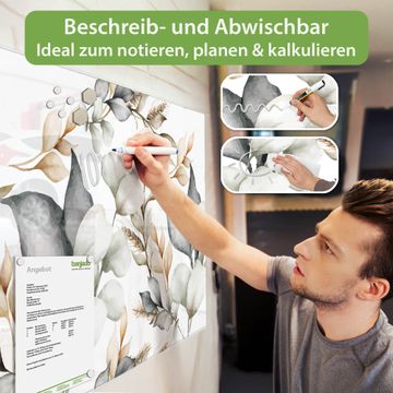 Die banjado Glas Magnettafel mit dem Motiv Motiv Sanfte Blätter verbindet Funktionalität mit Stil. Sie ersetzt das Zettelchaos durch klare Strukturen und bringt dabei eine warme, natürliche Atmosphäre in Ihr Zuhause. Ob im Büro, in der Küche oder im Eingangsbereich - dieses Design-Board zieht Blicke an und sorgt für Ordnung mit Charakter.