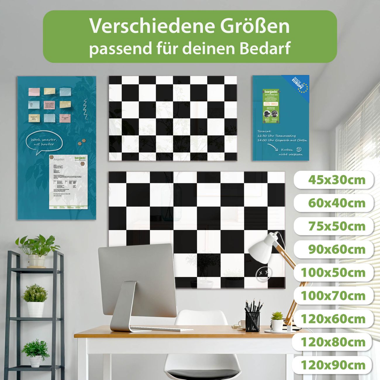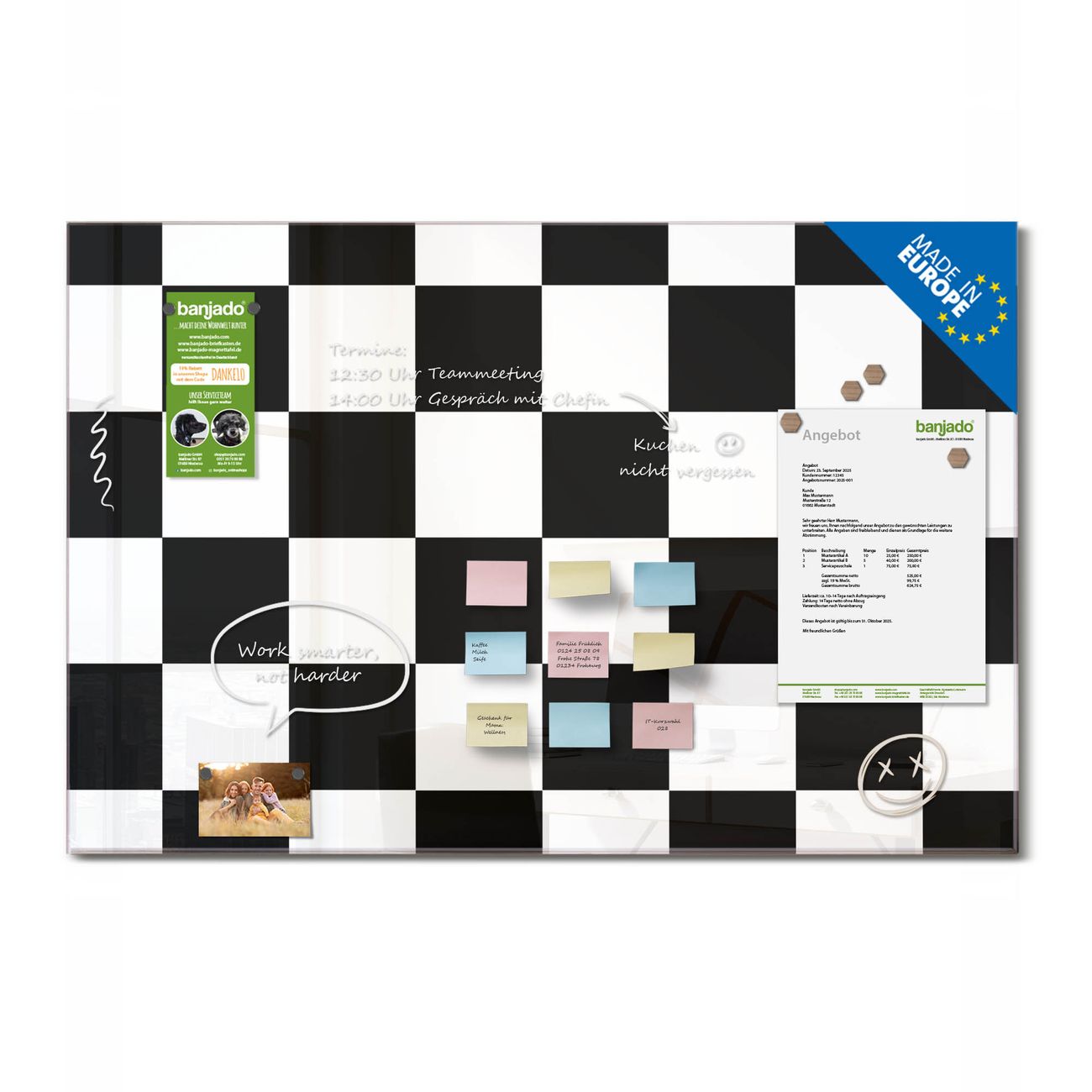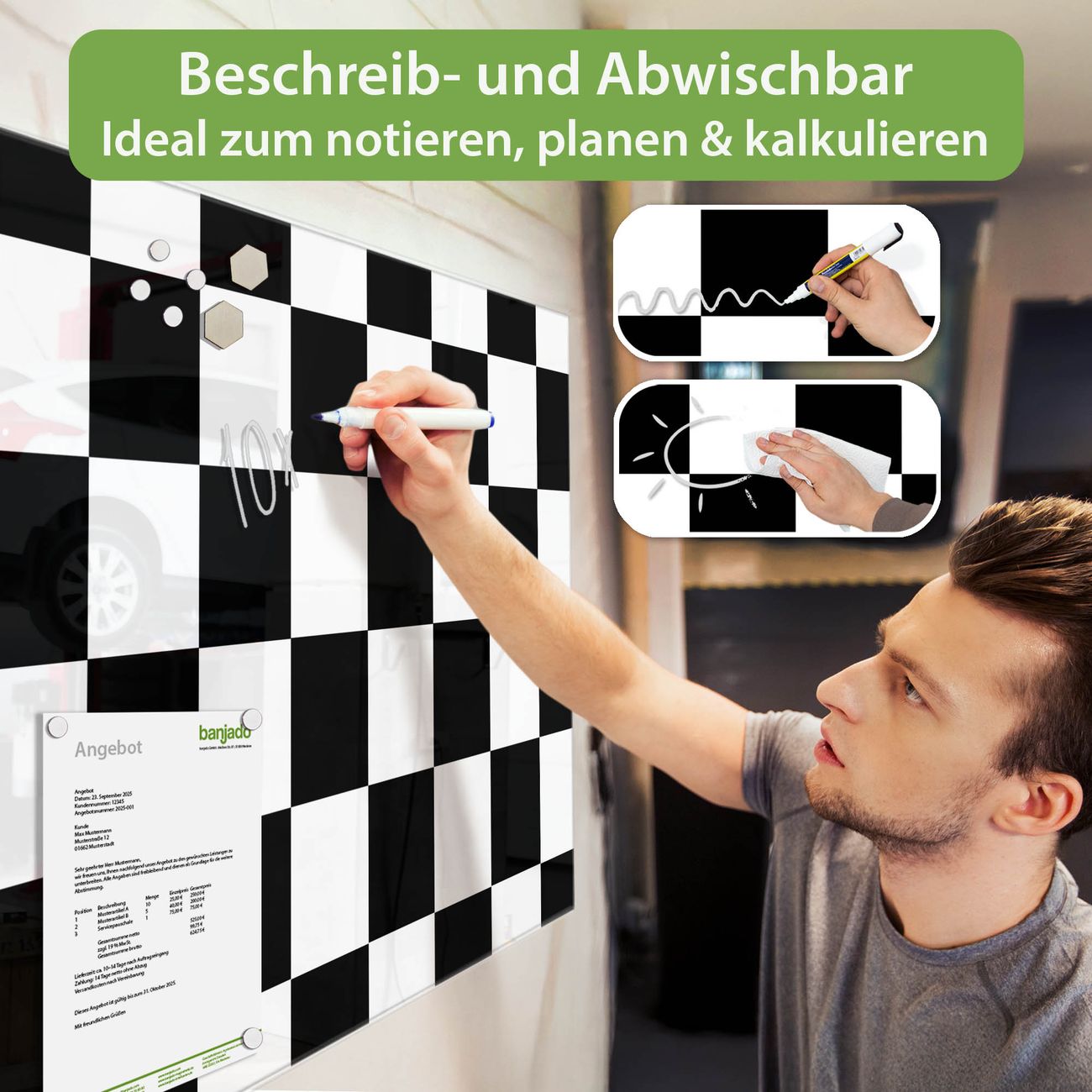 Jede Glas Magnettafel wird in unserer Werkstatt von Hand gefertigt und sorgfältig geprüft. So erhalten Sie ein echtes Qualitätsprodukt, das Funktion und Ästhetik perfekt vereint.?? Warum banjado?