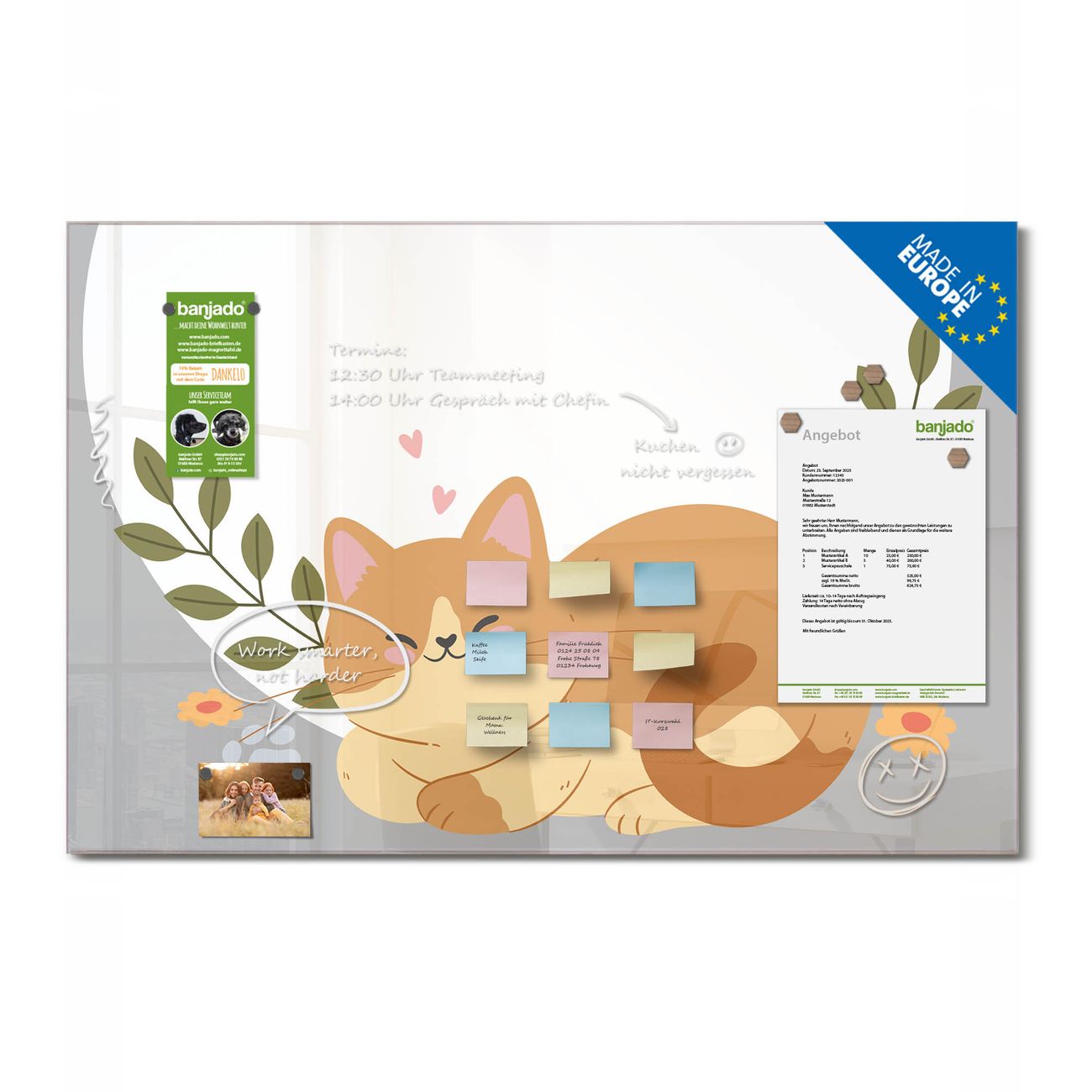 Jede Glas Magnettafel wird in unserer Werkstatt von Hand gefertigt und sorgfältig geprüft. So erhalten Sie ein echtes Qualitätsprodukt, das Funktion und Ästhetik perfekt vereint.?? Warum banjado?