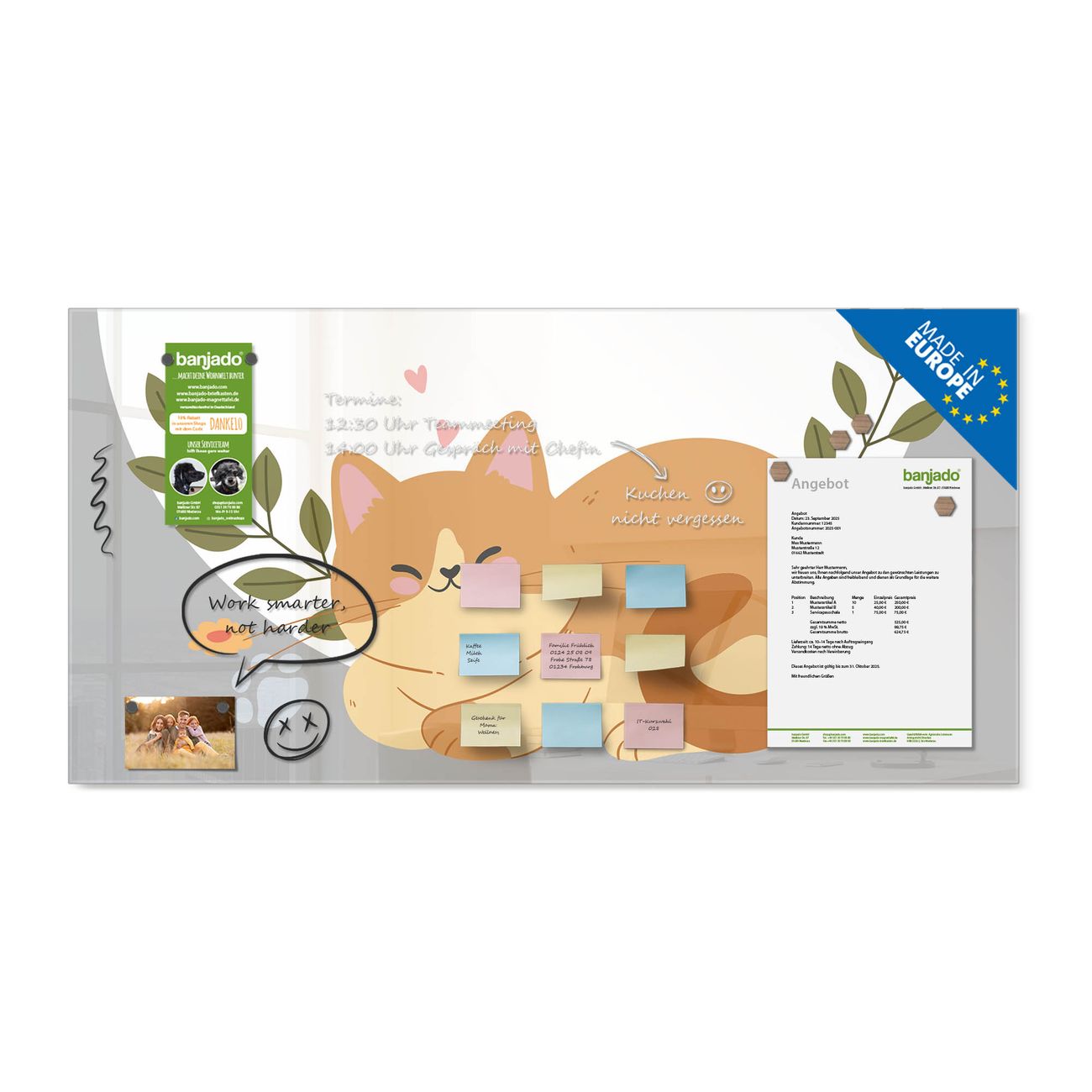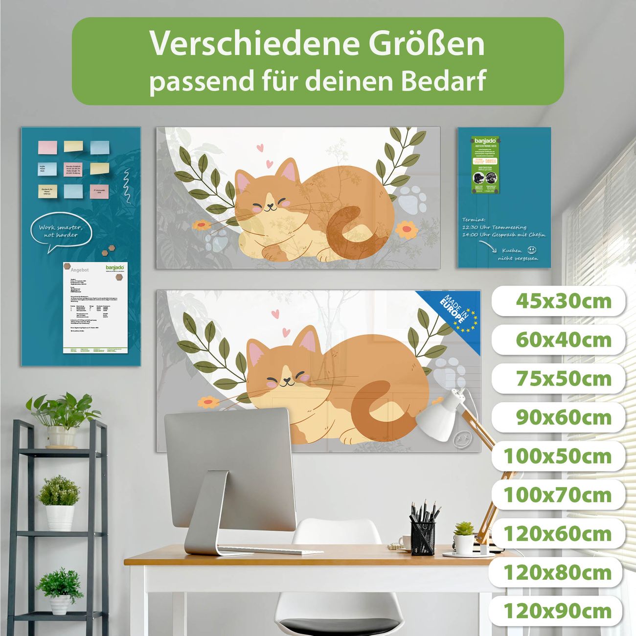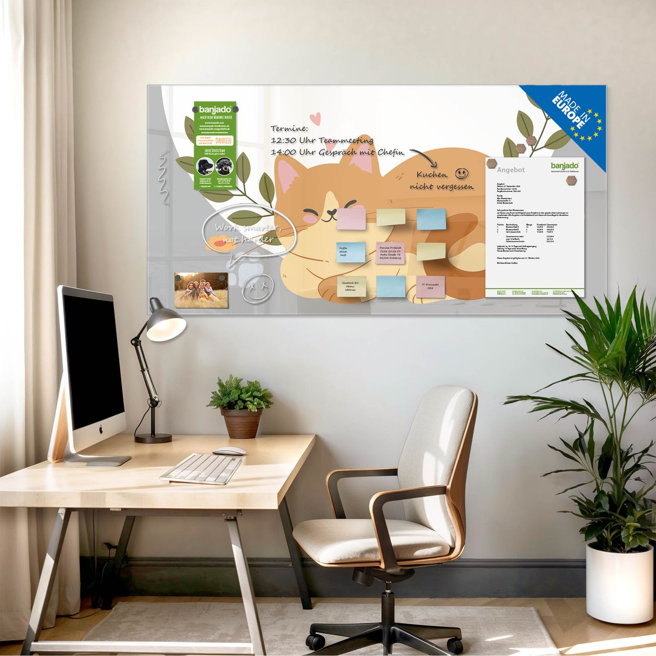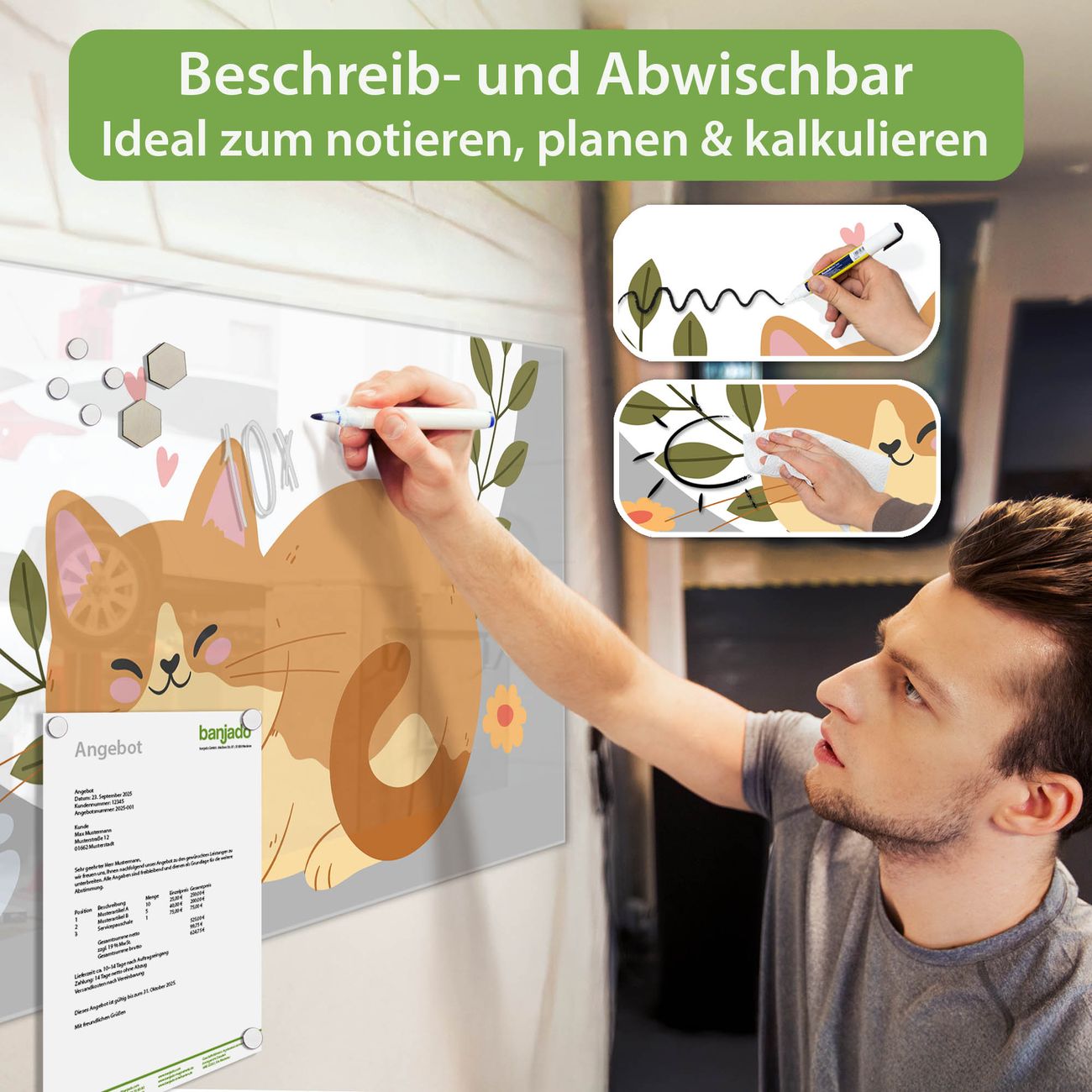 Jede Glas Magnettafel wird in unserer Werkstatt von Hand gefertigt und sorgfältig geprüft. So erhalten Sie ein echtes Qualitätsprodukt, das Funktion und Ästhetik perfekt vereint.?? Warum banjado?