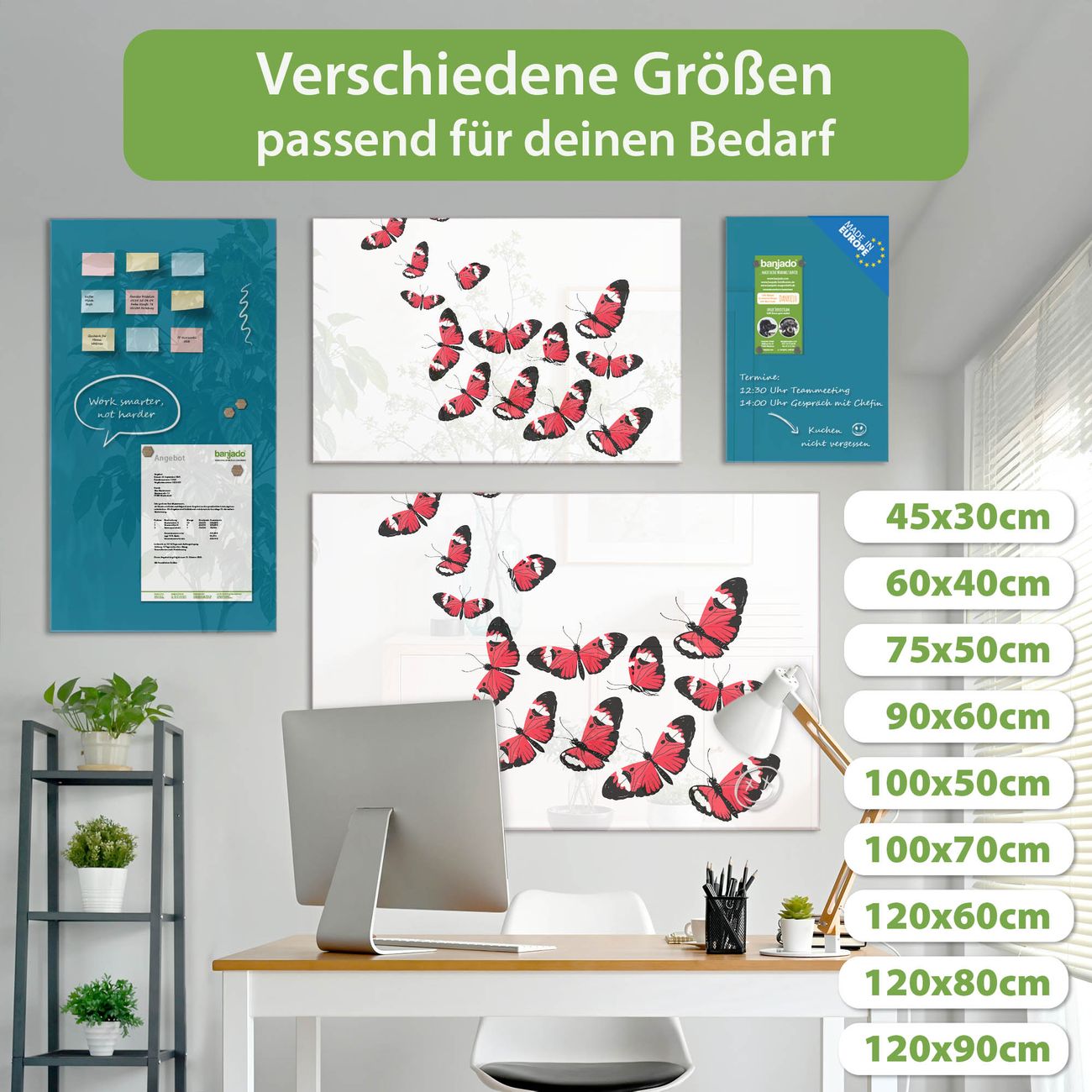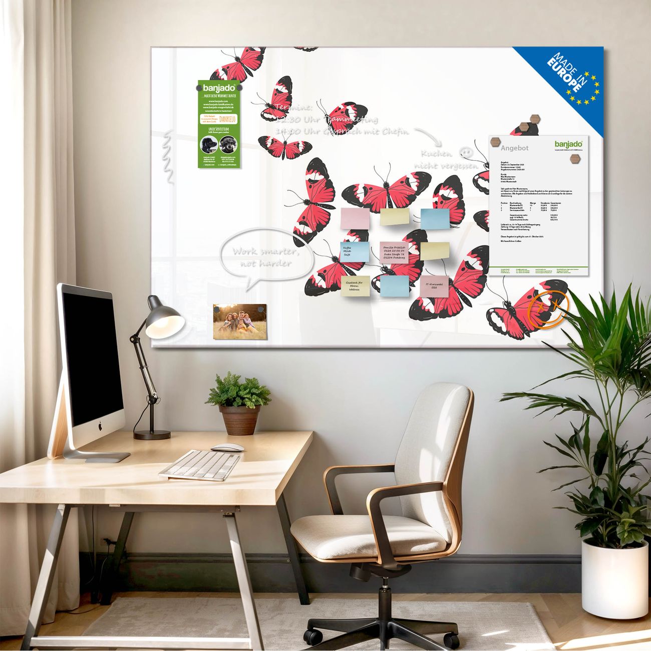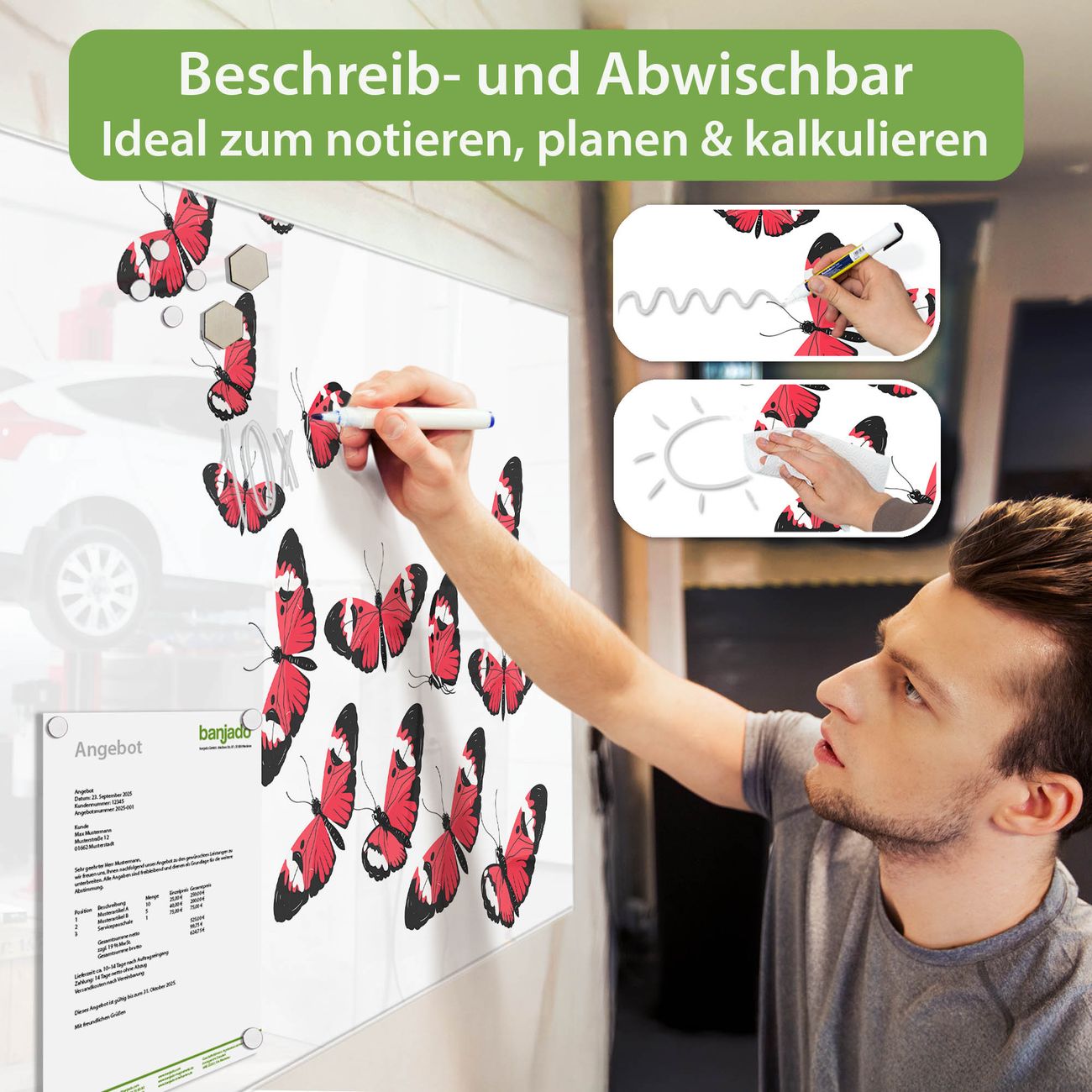 Die banjado Glas Magnettafel mit dem Motiv Motiv Schmetterlingsflug verbindet Funktionalität mit Stil. Sie ersetzt das Zettelchaos durch klare Strukturen und bringt dabei eine warme, natürliche Atmosphäre in Ihr Zuhause. Ob im Büro, in der Küche oder im Eingangsbereich - dieses Design-Board zieht Blicke an und sorgt für Ordnung mit Charakter.