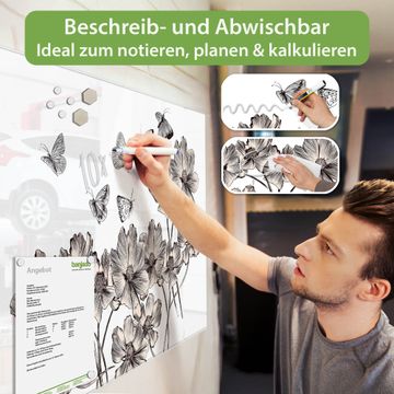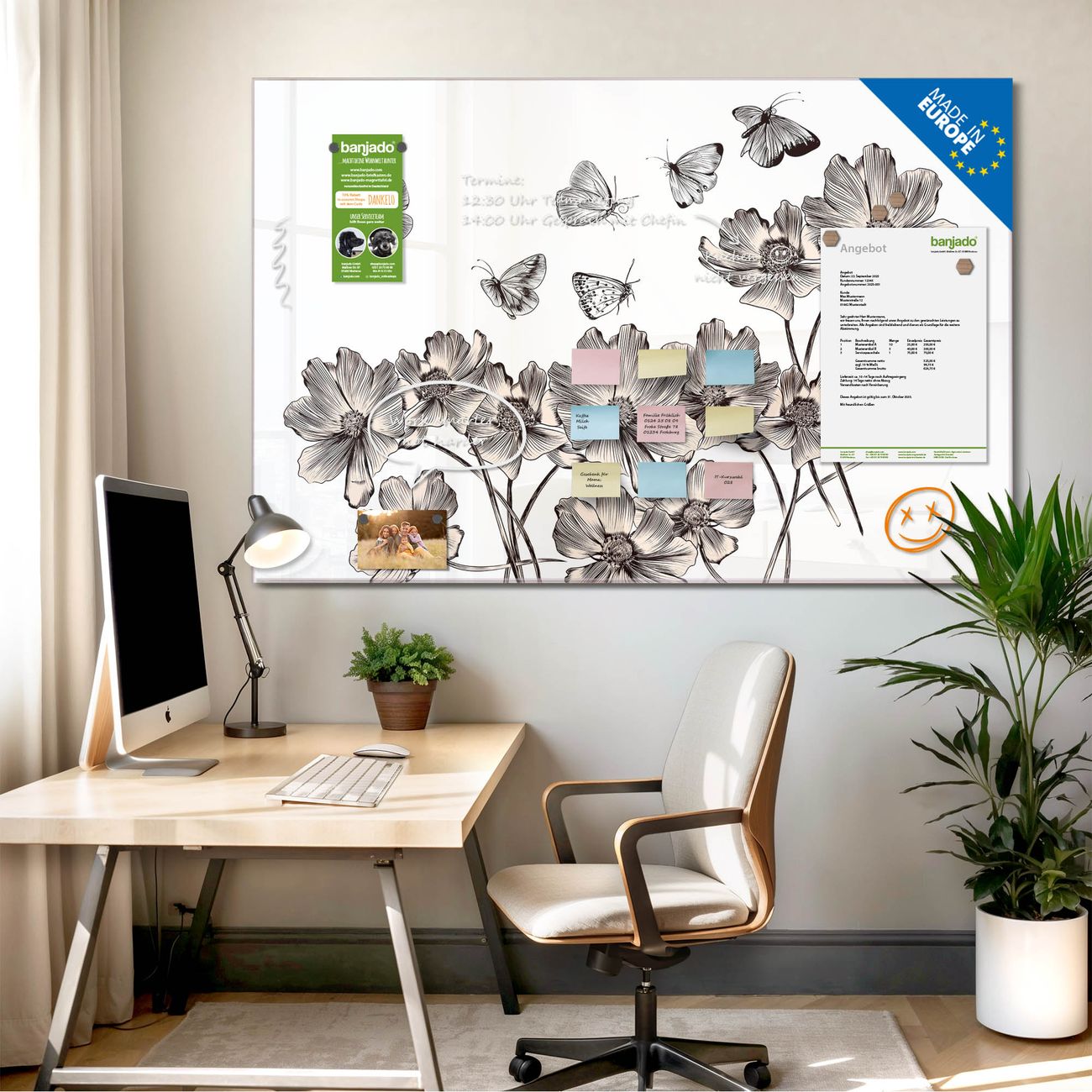 Die banjado Glas Magnettafel mit dem Motiv Motiv Schmetterlingsgarten verbindet Funktionalität mit Stil. Sie ersetzt das Zettelchaos durch klare Strukturen und bringt dabei eine warme, natürliche Atmosphäre in Ihr Zuhause. Ob im Büro, in der Küche oder im Eingangsbereich - dieses Design-Board zieht Blicke an und sorgt für Ordnung mit Charakter.