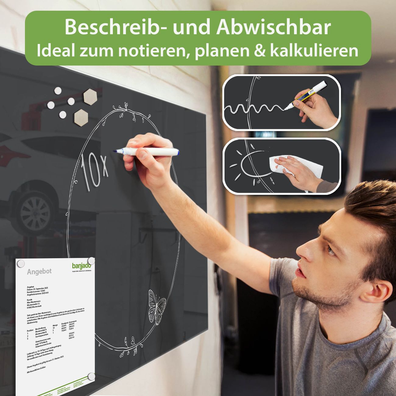 Bitte beachten Sie, dass ausschliessliche spezielle Magnete an der Glastafel haften. Wir empfehlen banjado Neodym Magnete, diese sind durch uns auf Wirksamkeit geprüft.