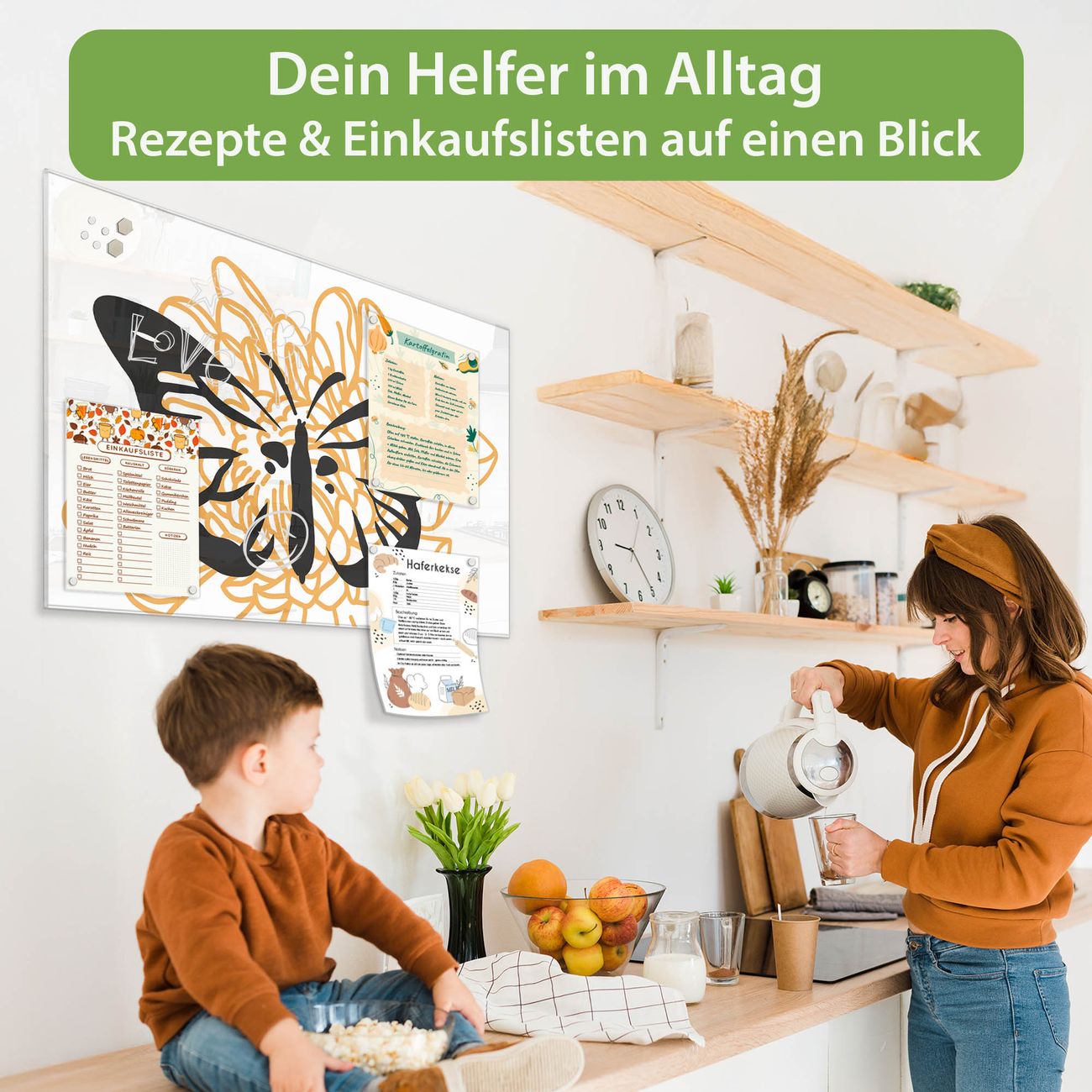 Ein Stück Design, das Ihren Alltag organisiert. Schreiben, heften, inspirieren - alles an einem Ort. Qualität, die man spürt. Montage leicht gemacht. Handwerk mit Herz - veredelt in Sachsen. Einzigartiges Design mit Motiv Motiv Schmetterlingsmystik Beschreibbare Glasoberfläche, leicht zu reinigen Starke Magnetkraft durch Stahlrückwand Inklusive 4 Neodym-Magneten Flexible Montageoptionen Handveredelt in Sachsen - Qualität, die bleibt