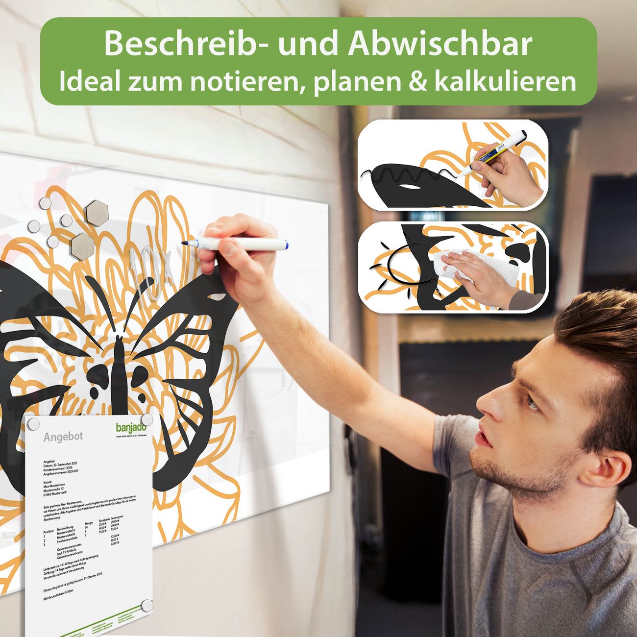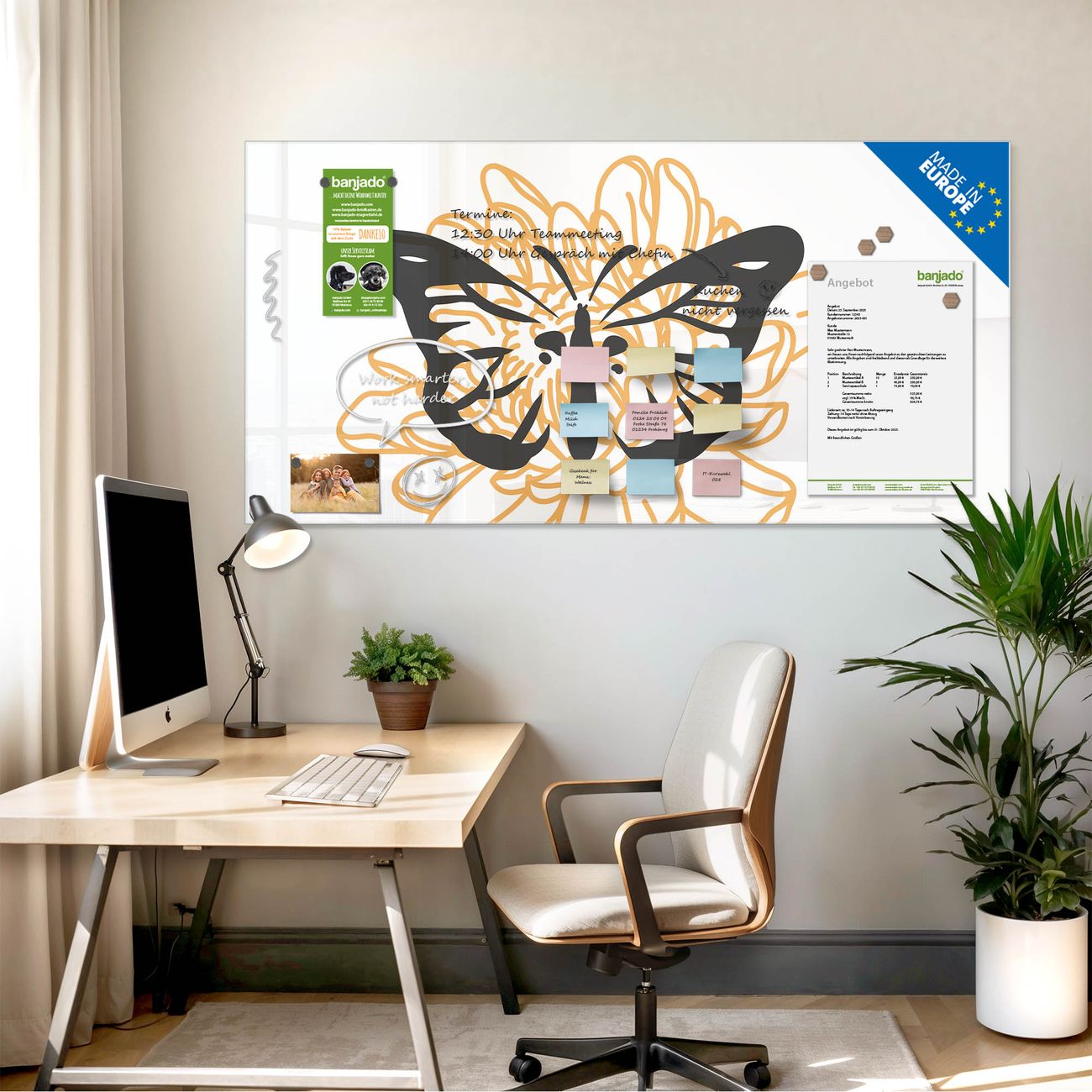 Die banjado Glas Magnettafel mit dem Motiv Motiv Schmetterlingsmystik verbindet Funktionalität mit Stil. Sie ersetzt das Zettelchaos durch klare Strukturen und bringt dabei eine warme, natürliche Atmosphäre in Ihr Zuhause. Ob im Büro, in der Küche oder im Eingangsbereich - dieses Design-Board zieht Blicke an und sorgt für Ordnung mit Charakter.