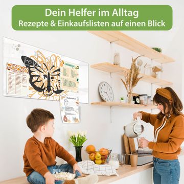 Auf der glatten Glasoberfläche lassen sich Termine, Rezepte oder Notizen ganz einfach mit Kreidestiften festhalten und rückstandslos entfernen. Starke Neodym-Magnete halten Ihre wichtigsten Erinnerungen sicher an Ort und Stelle. So entsteht Ihre ganz persönliche Ideenwand - jeden Tag neu.