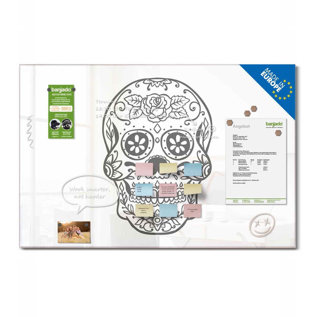 Ein Stück Design, das Ihren Alltag organisiert. Schreiben, heften, inspirieren - alles an einem Ort. Qualität, die man spürt. Montage leicht gemacht. Handwerk mit Herz - veredelt in Sachsen. Einzigartiges Design mit Motiv Motiv Schwarz-Weiß Sugar Skull Beschreibbare Glasoberfläche, leicht zu reinigen Starke Magnetkraft durch Stahlrückwand Inklusive 4 Neodym-Magneten Flexible Montageoptionen Handveredelt in Sachsen - Qualität, die bleibt