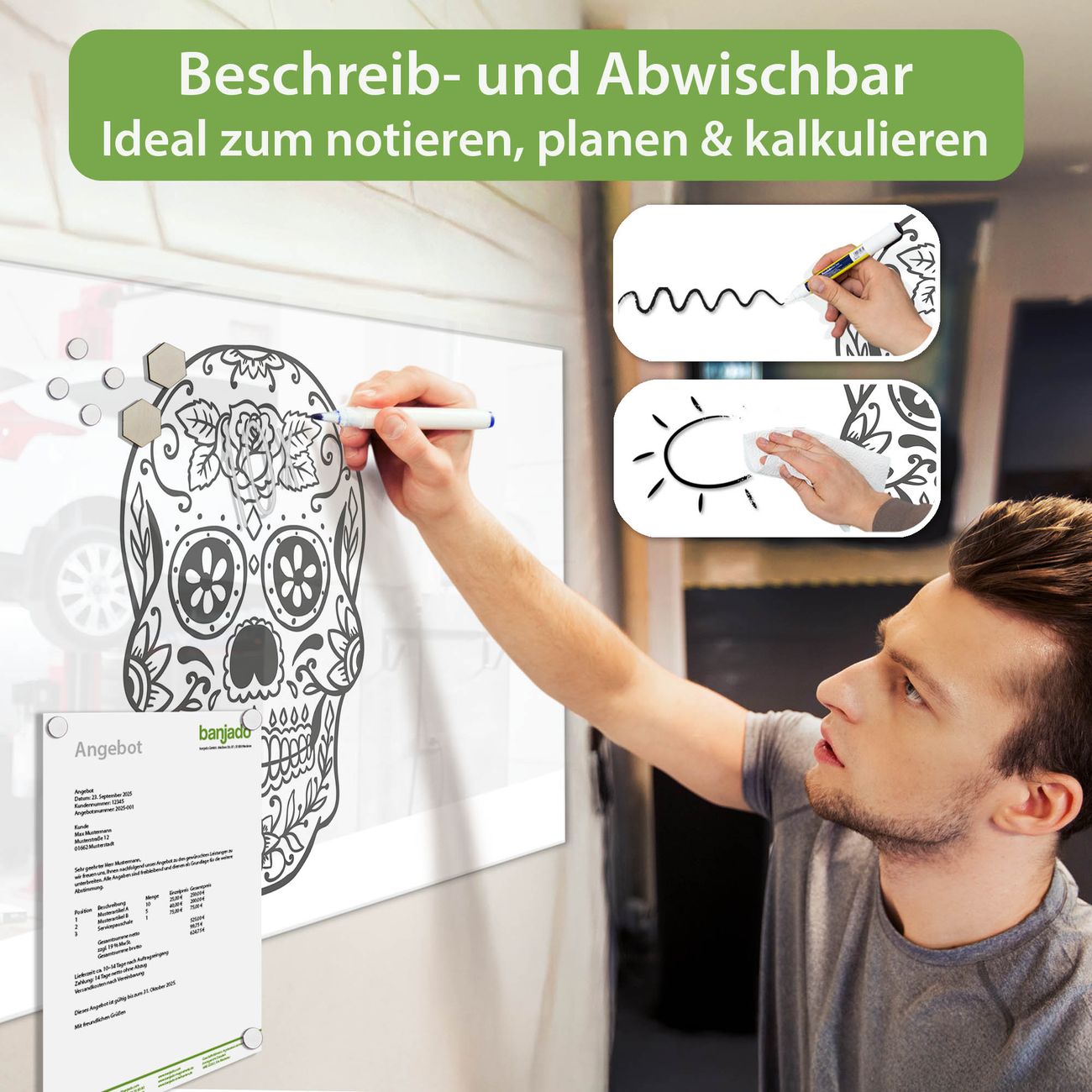 Ein Stück Design, das Ihren Alltag organisiert. Schreiben, heften, inspirieren - alles an einem Ort. Qualität, die man spürt. Montage leicht gemacht. Handwerk mit Herz - veredelt in Sachsen. Einzigartiges Design mit Motiv Motiv Schwarz-Weiß Sugar Skull Beschreibbare Glasoberfläche, leicht zu reinigen Starke Magnetkraft durch Stahlrückwand Inklusive 4 Neodym-Magneten Flexible Montageoptionen Handveredelt in Sachsen - Qualität, die bleibt