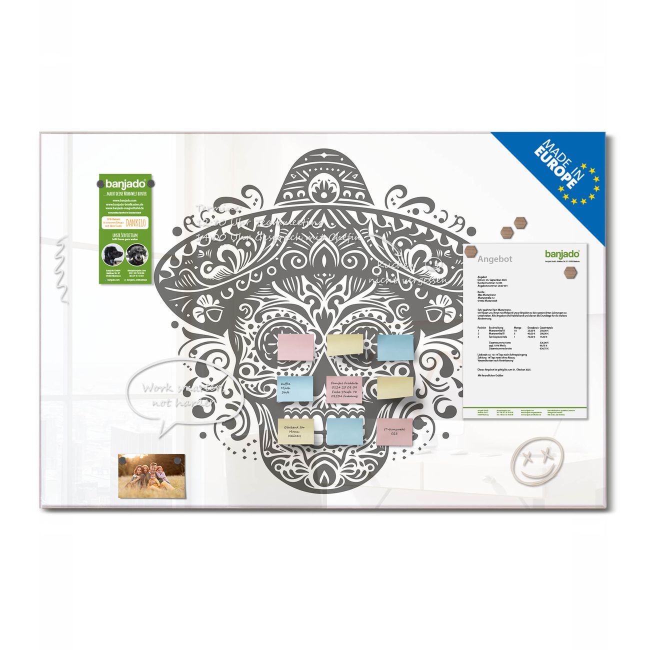 Jede Glas Magnettafel wird in unserer Werkstatt von Hand gefertigt und sorgfältig geprüft. So erhalten Sie ein echtes Qualitätsprodukt, das Funktion und Ästhetik perfekt vereint.?? Warum banjado?