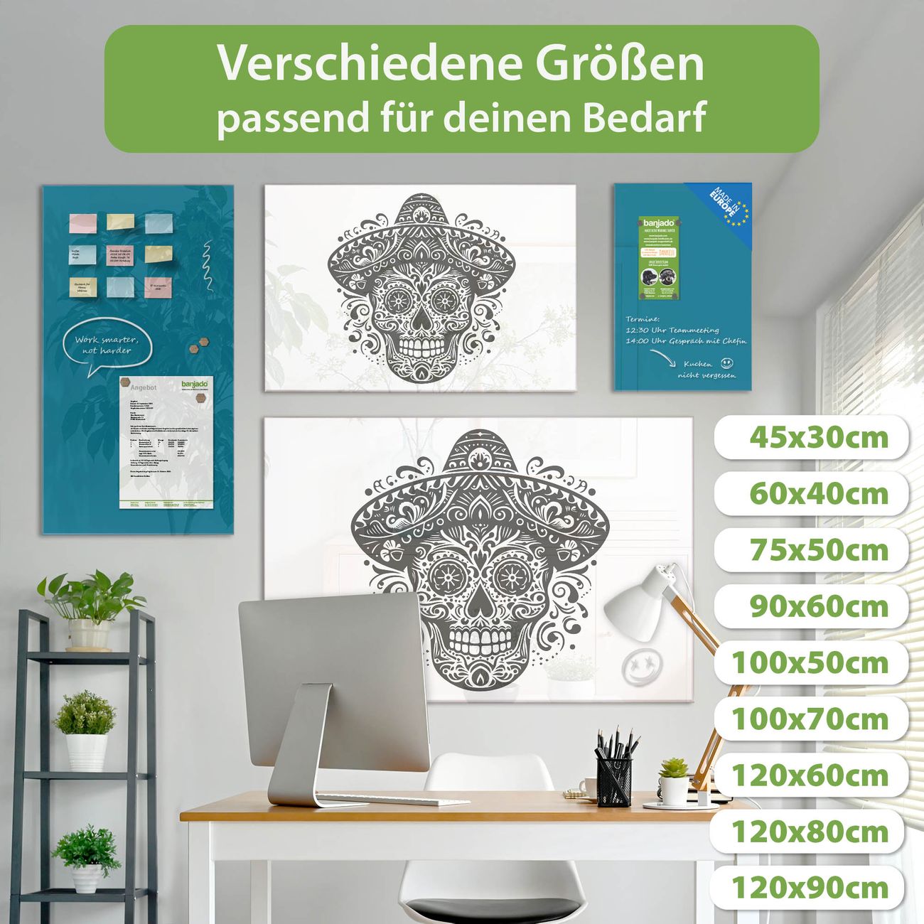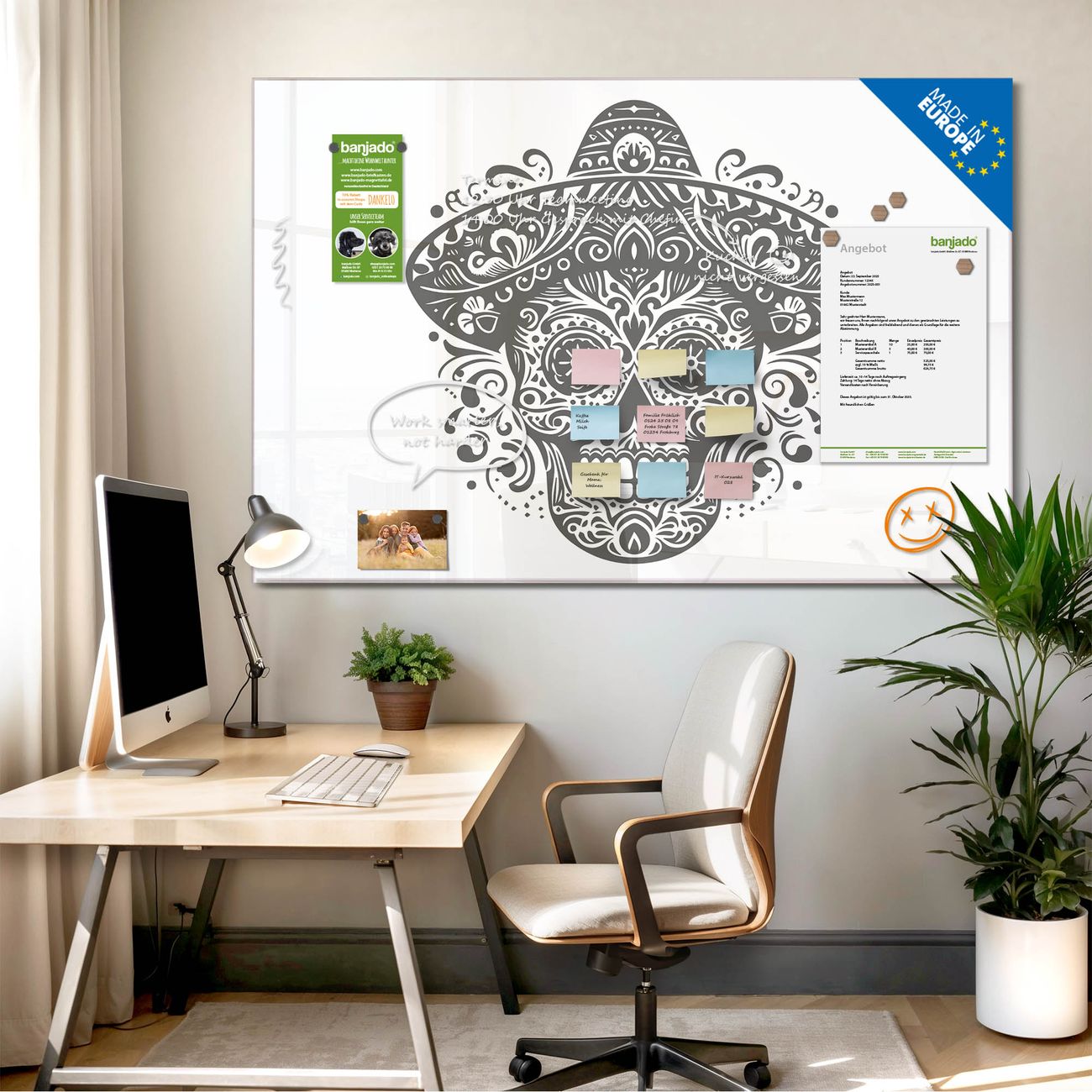 Die banjado Glas Magnettafel mit dem Motiv Motiv Sombrero Totenkopf verbindet Funktionalität mit Stil. Sie ersetzt das Zettelchaos durch klare Strukturen und bringt dabei eine warme, natürliche Atmosphäre in Ihr Zuhause. Ob im Büro, in der Küche oder im Eingangsbereich - dieses Design-Board zieht Blicke an und sorgt für Ordnung mit Charakter.