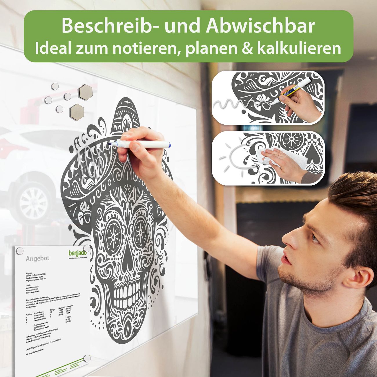 Ein Stück Design, das Ihren Alltag organisiert. Schreiben, heften, inspirieren - alles an einem Ort. Qualität, die man spürt. Montage leicht gemacht. Handwerk mit Herz - veredelt in Sachsen. Einzigartiges Design mit Motiv Motiv Sombrero Totenkopf Beschreibbare Glasoberfläche, leicht zu reinigen Starke Magnetkraft durch Stahlrückwand Inklusive 4 Neodym-Magneten Flexible Montageoptionen Handveredelt in Sachsen - Qualität, die bleibt