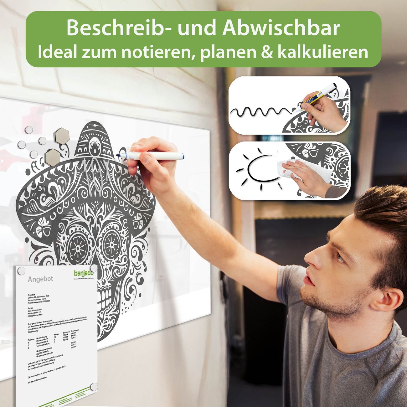 Die banjado Glas Magnettafel mit dem Motiv Motiv Sombrero Totenkopf verbindet Funktionalität mit Stil. Sie ersetzt das Zettelchaos durch klare Strukturen und bringt dabei eine warme, natürliche Atmosphäre in Ihr Zuhause. Ob im Büro, in der Küche oder im Eingangsbereich - dieses Design-Board zieht Blicke an und sorgt für Ordnung mit Charakter.