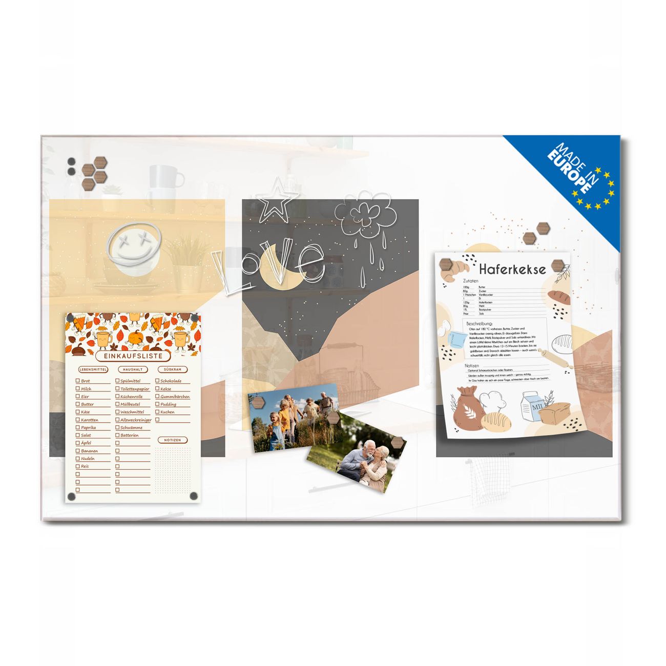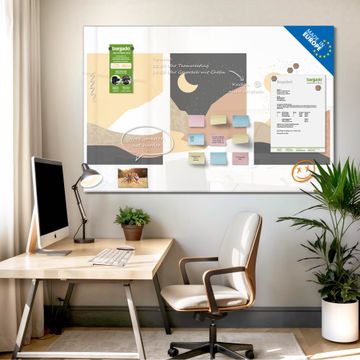 Auf der glatten Glasoberfläche lassen sich Termine, Rezepte oder Notizen ganz einfach mit Kreidestiften festhalten und rückstandslos entfernen. Starke Neodym-Magnete halten Ihre wichtigsten Erinnerungen sicher an Ort und Stelle. So entsteht Ihre ganz persönliche Ideenwand - jeden Tag neu.