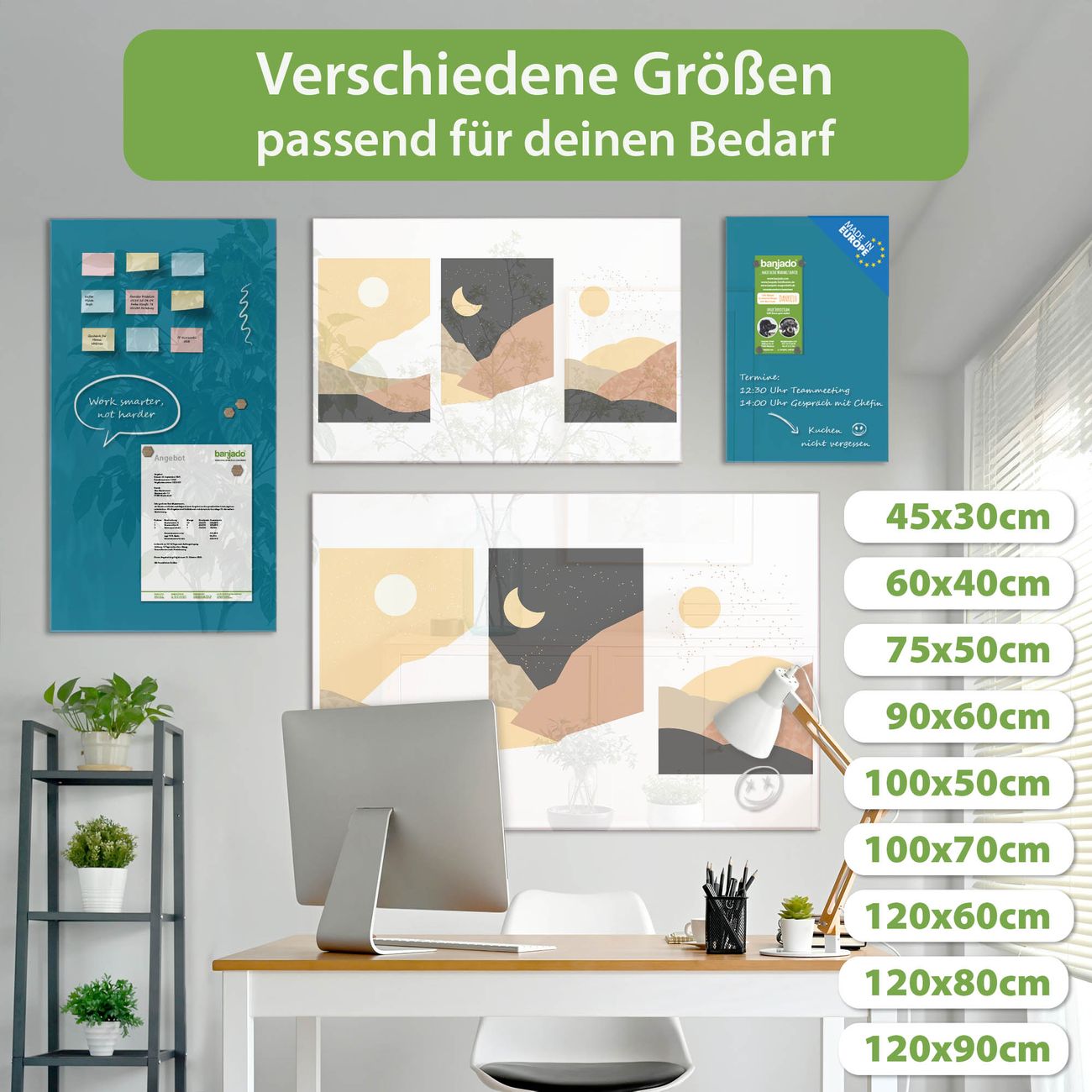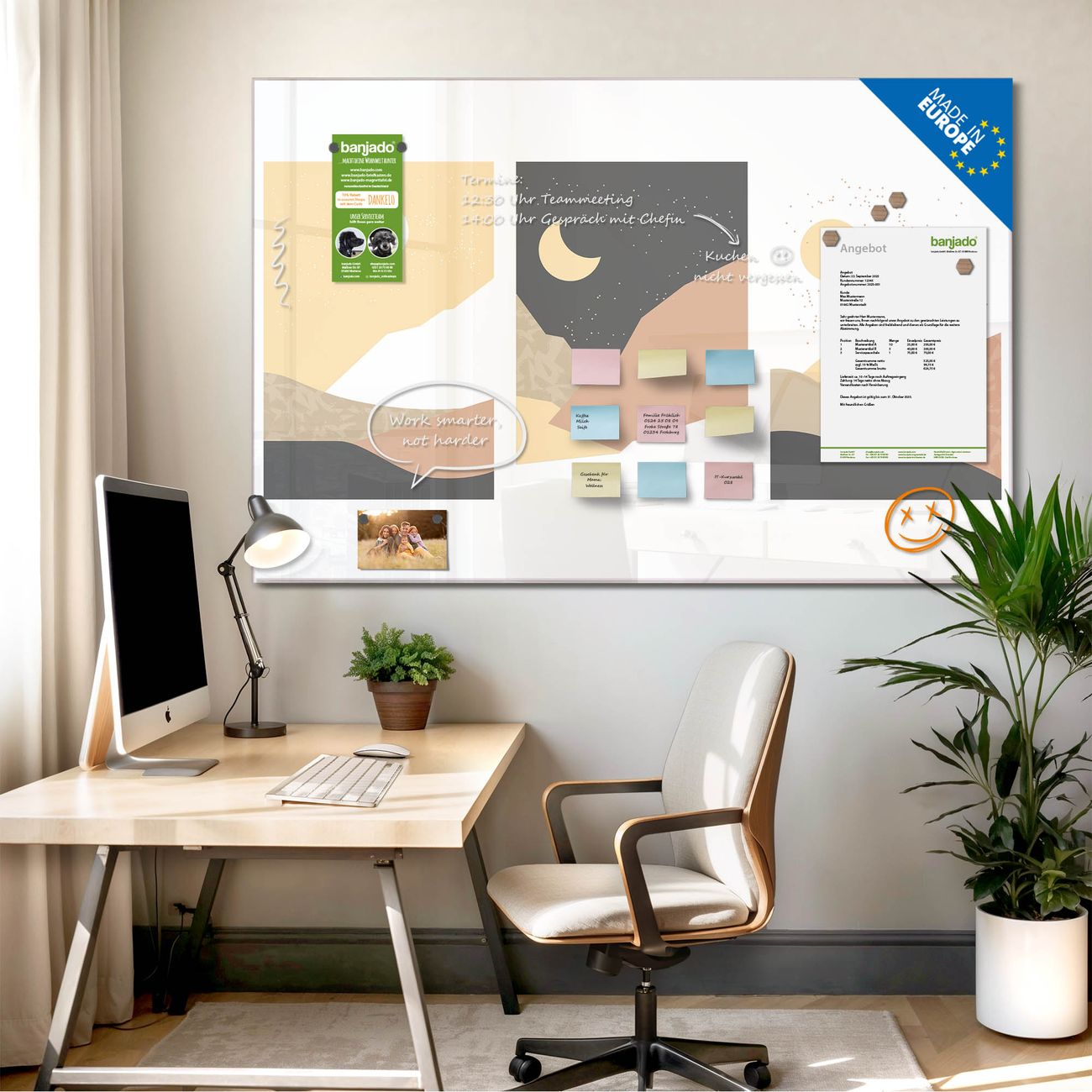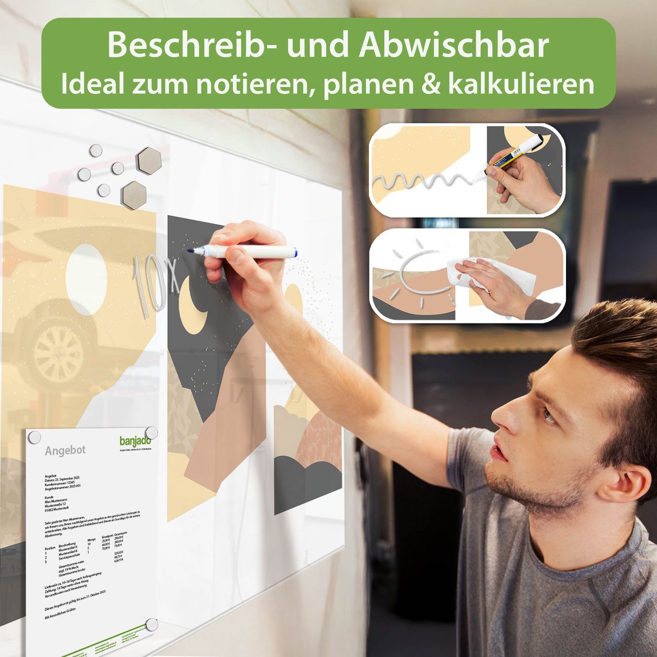 Jede Glas Magnettafel wird in unserer Werkstatt von Hand gefertigt und sorgfältig geprüft. So erhalten Sie ein echtes Qualitätsprodukt, das Funktion und Ästhetik perfekt vereint.?? Warum banjado?