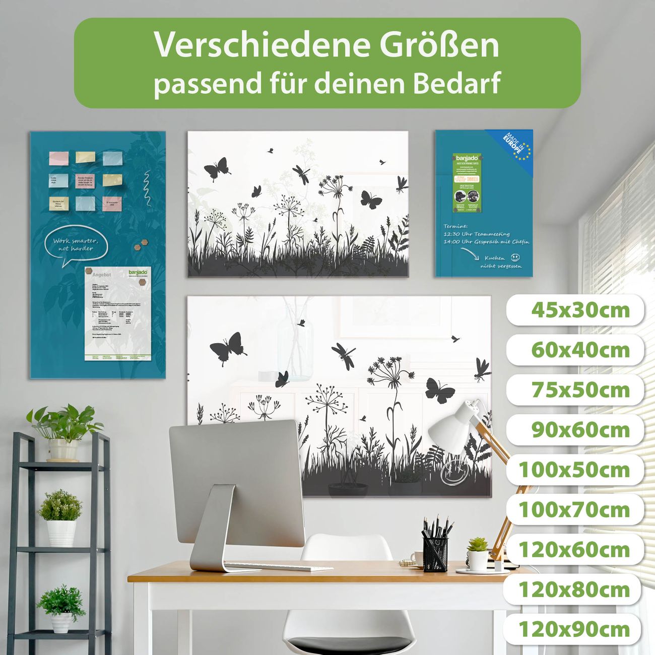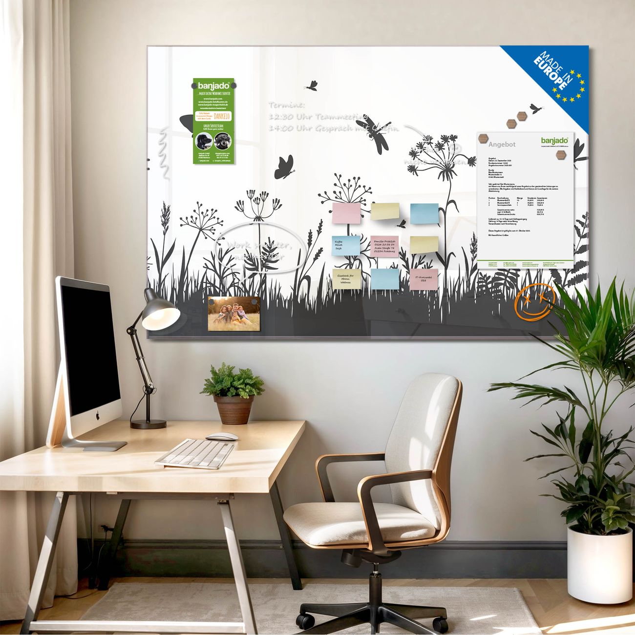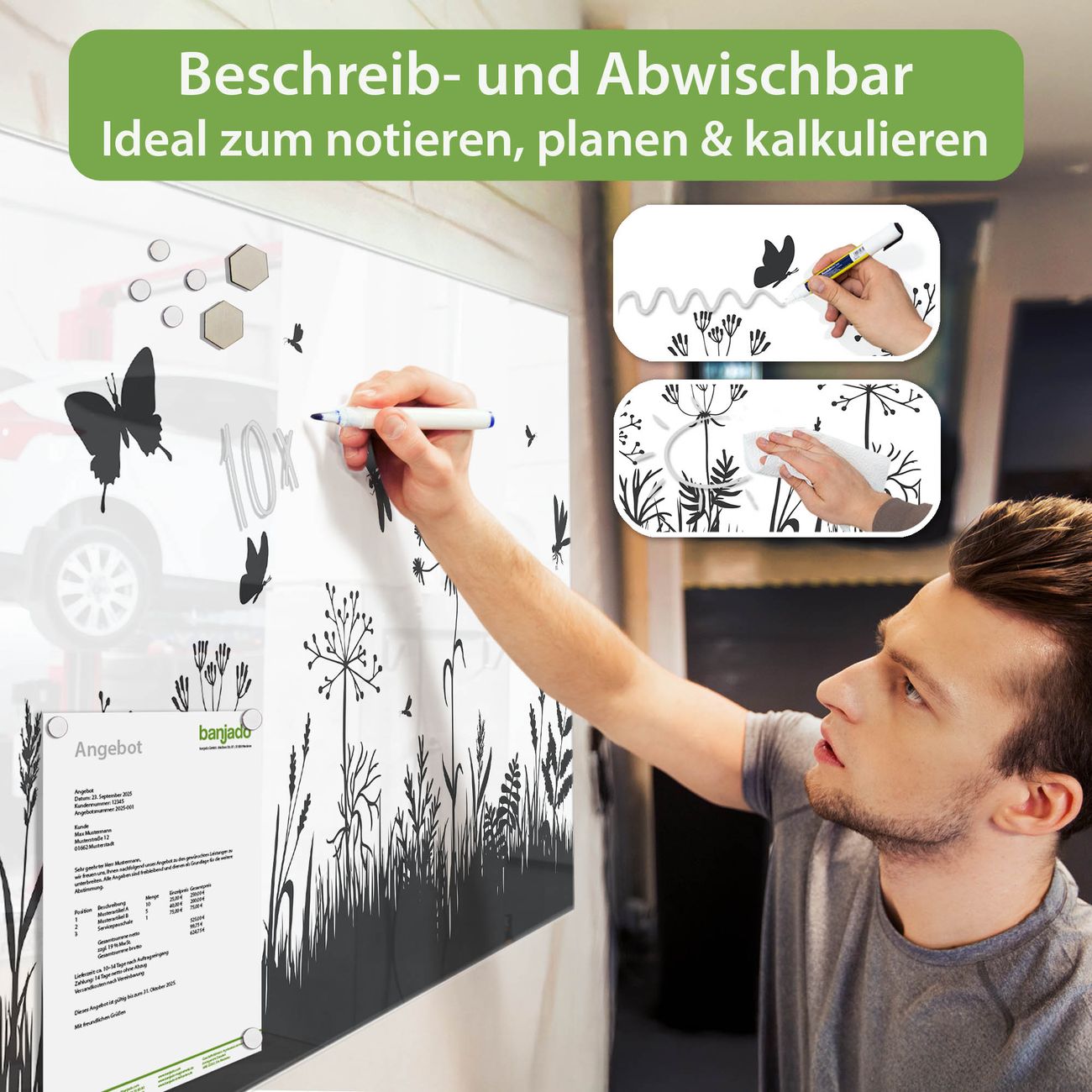 Jede Glas Magnettafel wird in unserer Werkstatt von Hand gefertigt und sorgfältig geprüft. So erhalten Sie ein echtes Qualitätsprodukt, das Funktion und Ästhetik perfekt vereint.?? Warum banjado?