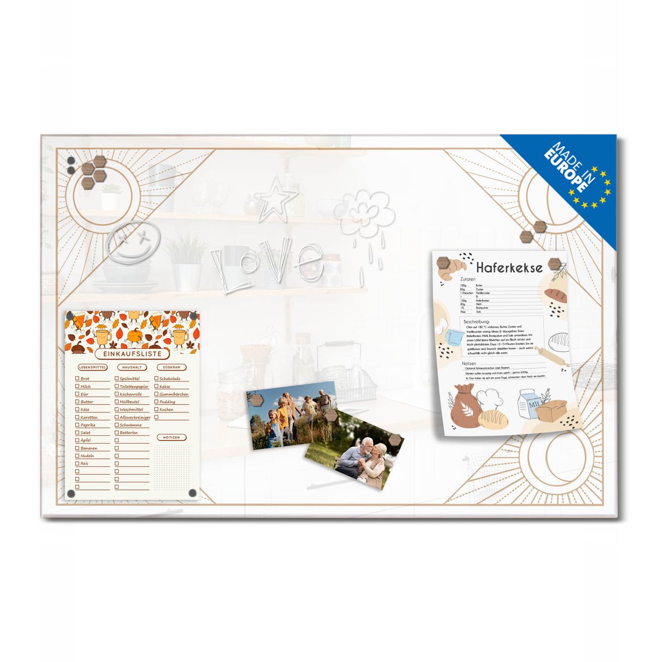 Ein Stück Design, das Ihren Alltag organisiert. Schreiben, heften, inspirieren - alles an einem Ort. Qualität, die man spürt. Montage leicht gemacht. Handwerk mit Herz - veredelt in Sachsen. Einzigartiges Design mit Motiv Motiv Sonnen- und Mondrahmen Beschreibbare Glasoberfläche, leicht zu reinigen Starke Magnetkraft durch Stahlrückwand Inklusive 4 Neodym-Magneten Flexible Montageoptionen Handveredelt in Sachsen - Qualität, die bleibt