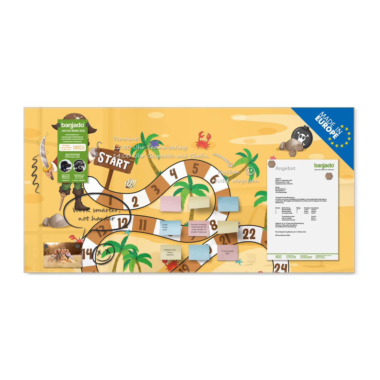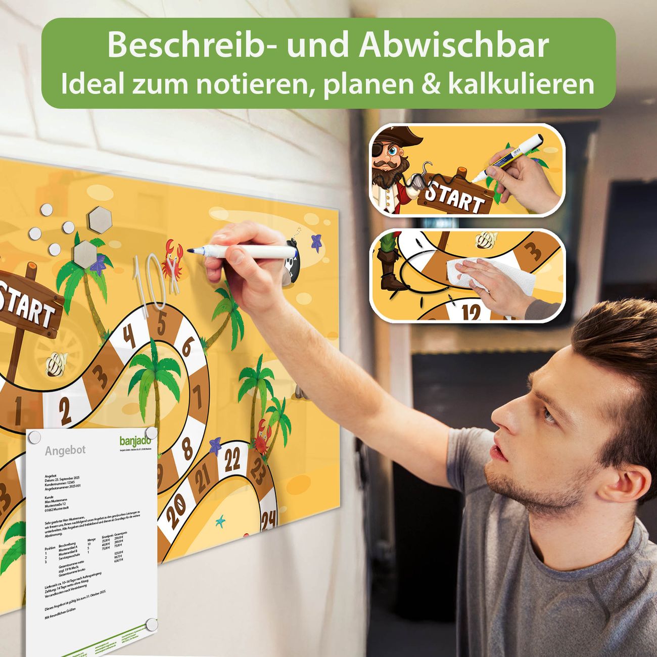 Jede Glas Magnettafel wird in unserer Werkstatt von Hand gefertigt und sorgfältig geprüft. So erhalten Sie ein echtes Qualitätsprodukt, das Funktion und Ästhetik perfekt vereint.?? Warum banjado?