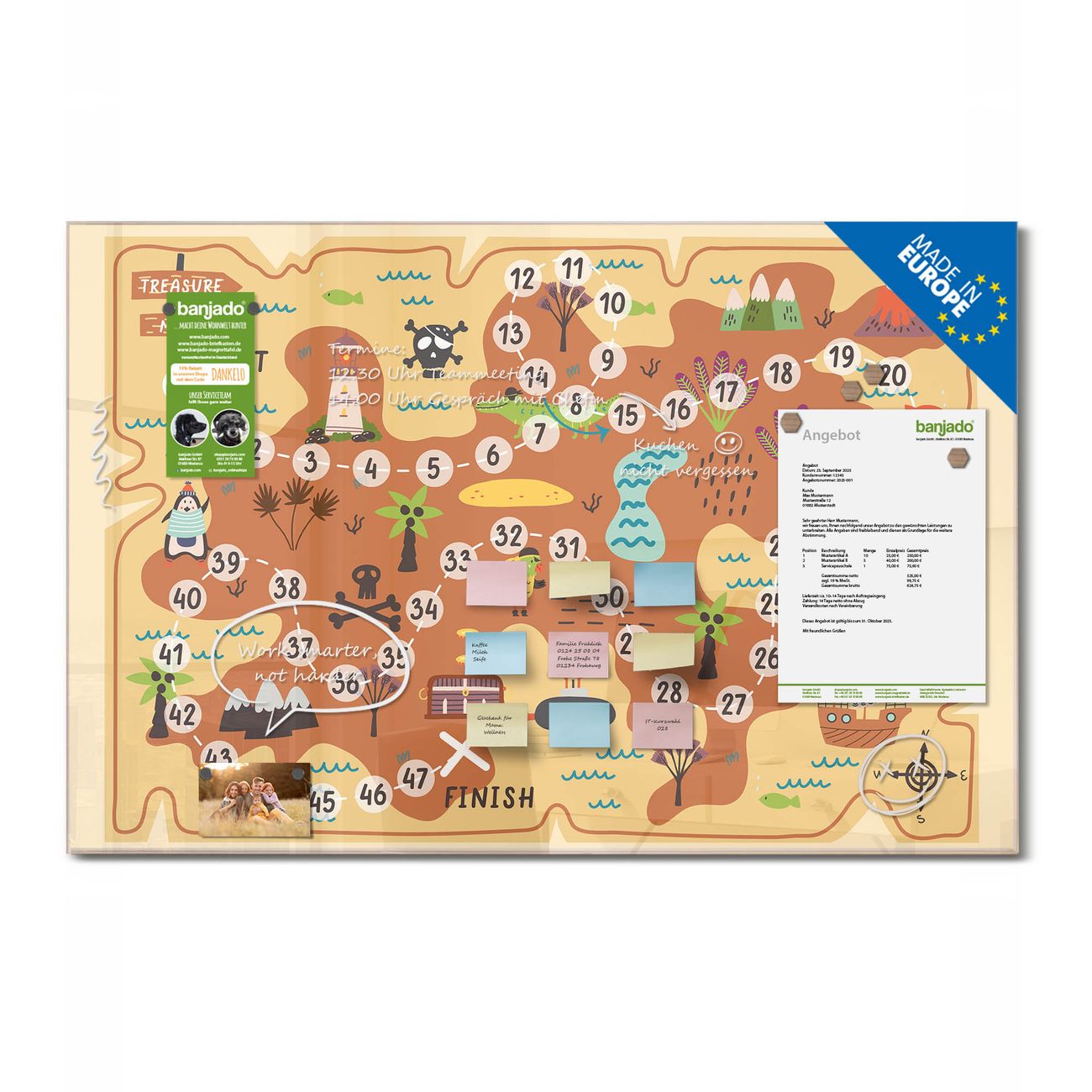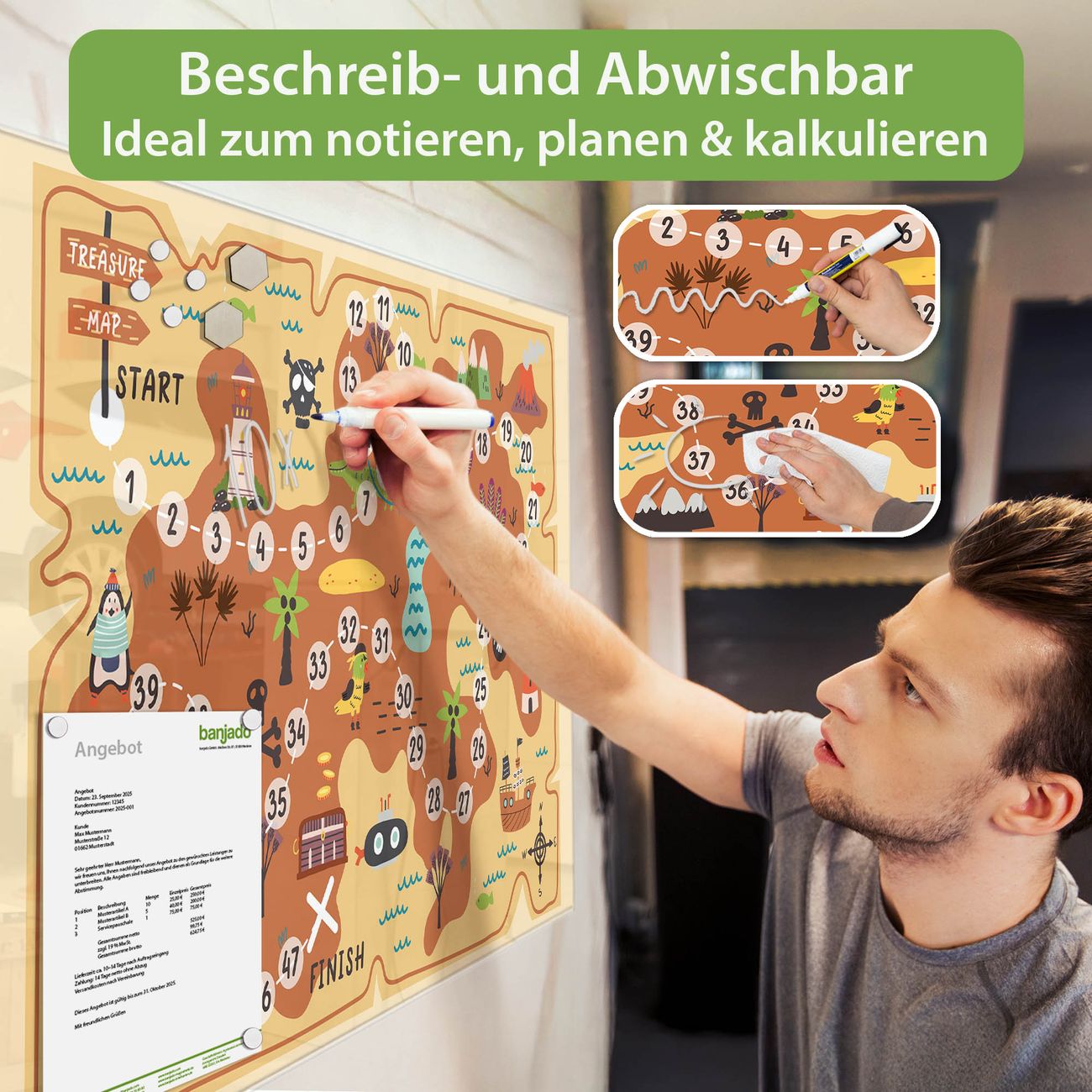 Jede Glas Magnettafel wird in unserer Werkstatt von Hand gefertigt und sorgfältig geprüft. So erhalten Sie ein echtes Qualitätsprodukt, das Funktion und Ästhetik perfekt vereint.?? Warum banjado?