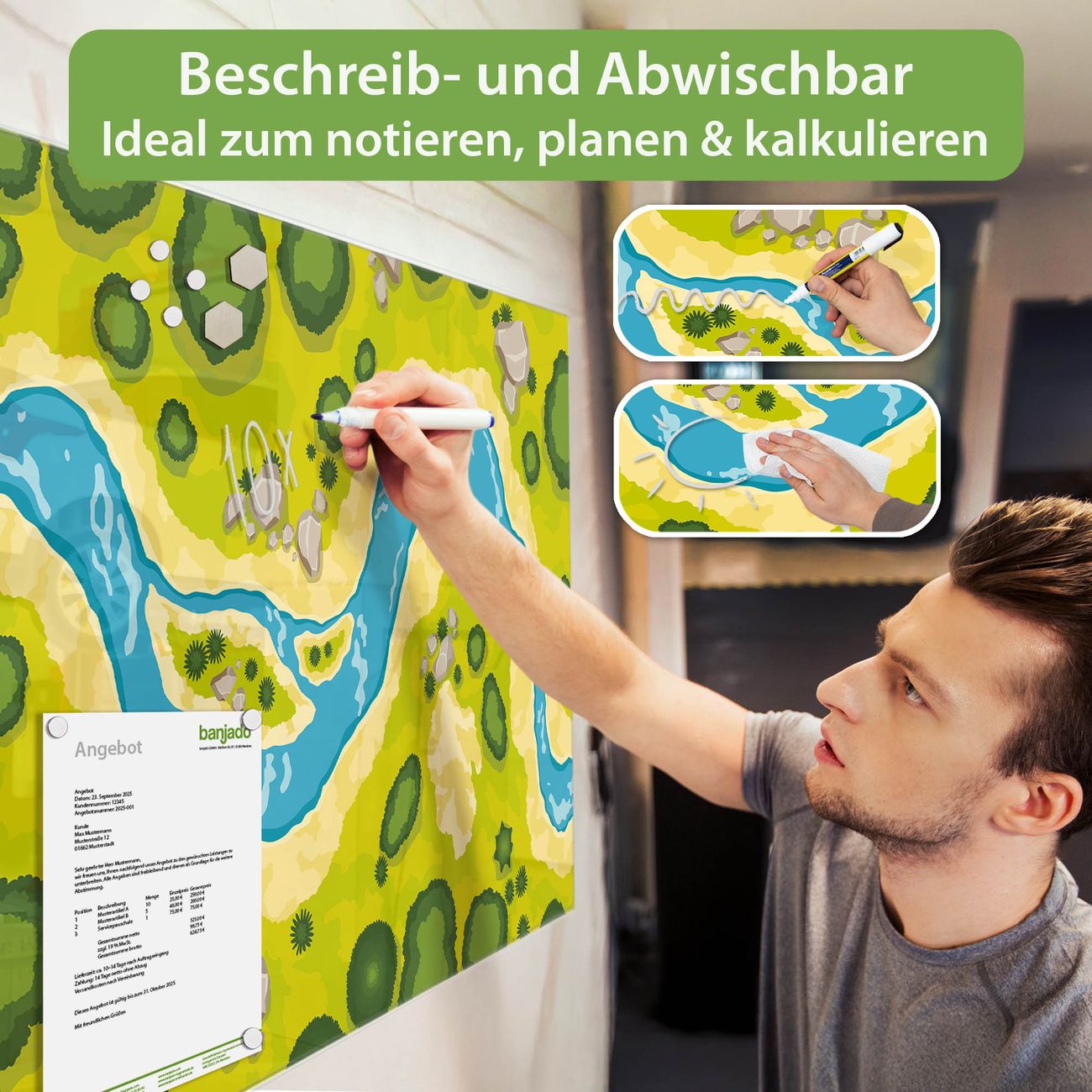 Jede Glas Magnettafel wird in unserer Werkstatt von Hand gefertigt und sorgfältig geprüft. So erhalten Sie ein echtes Qualitätsprodukt, das Funktion und Ästhetik perfekt vereint.?? Warum banjado?
