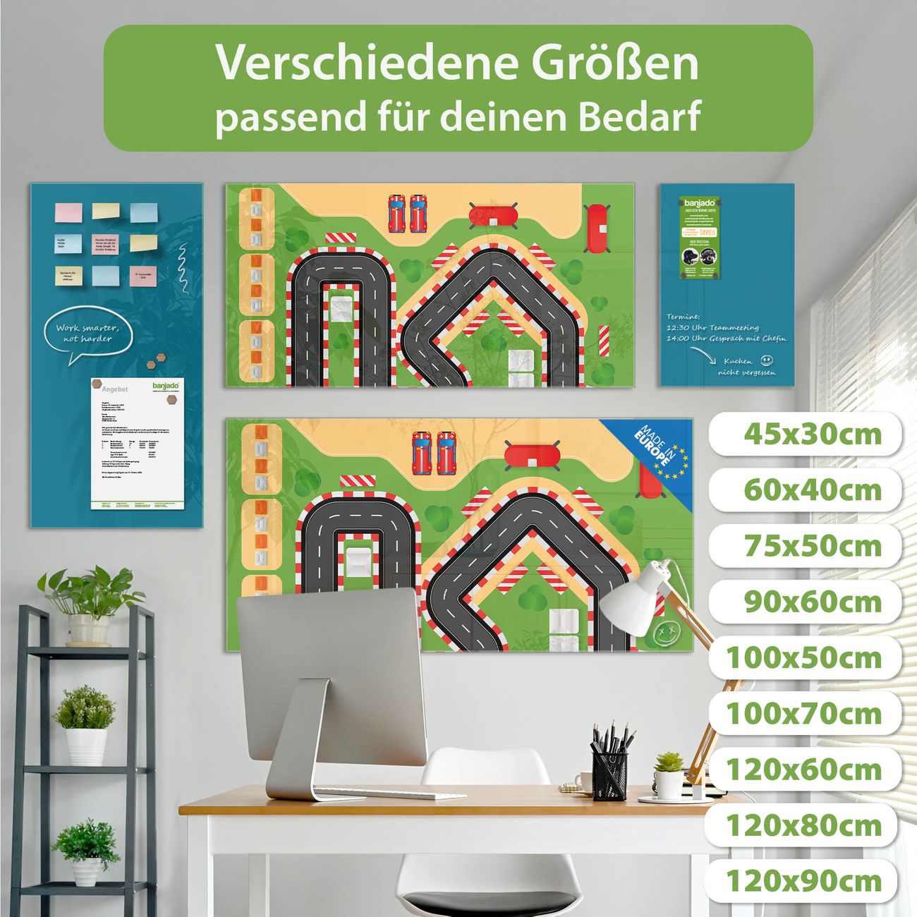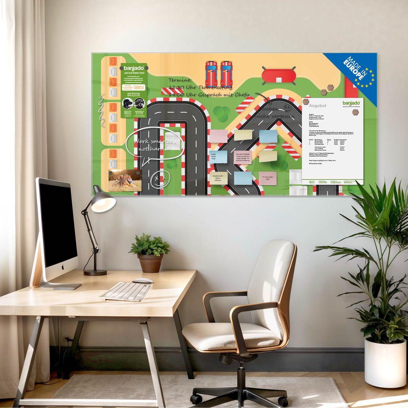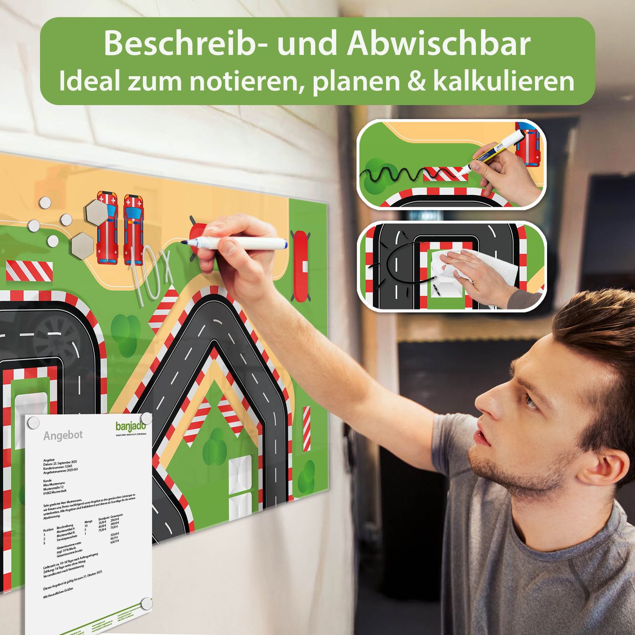 Jede Glas Magnettafel wird in unserer Werkstatt von Hand gefertigt und sorgfältig geprüft. So erhalten Sie ein echtes Qualitätsprodukt, das Funktion und Ästhetik perfekt vereint.?? Warum banjado?