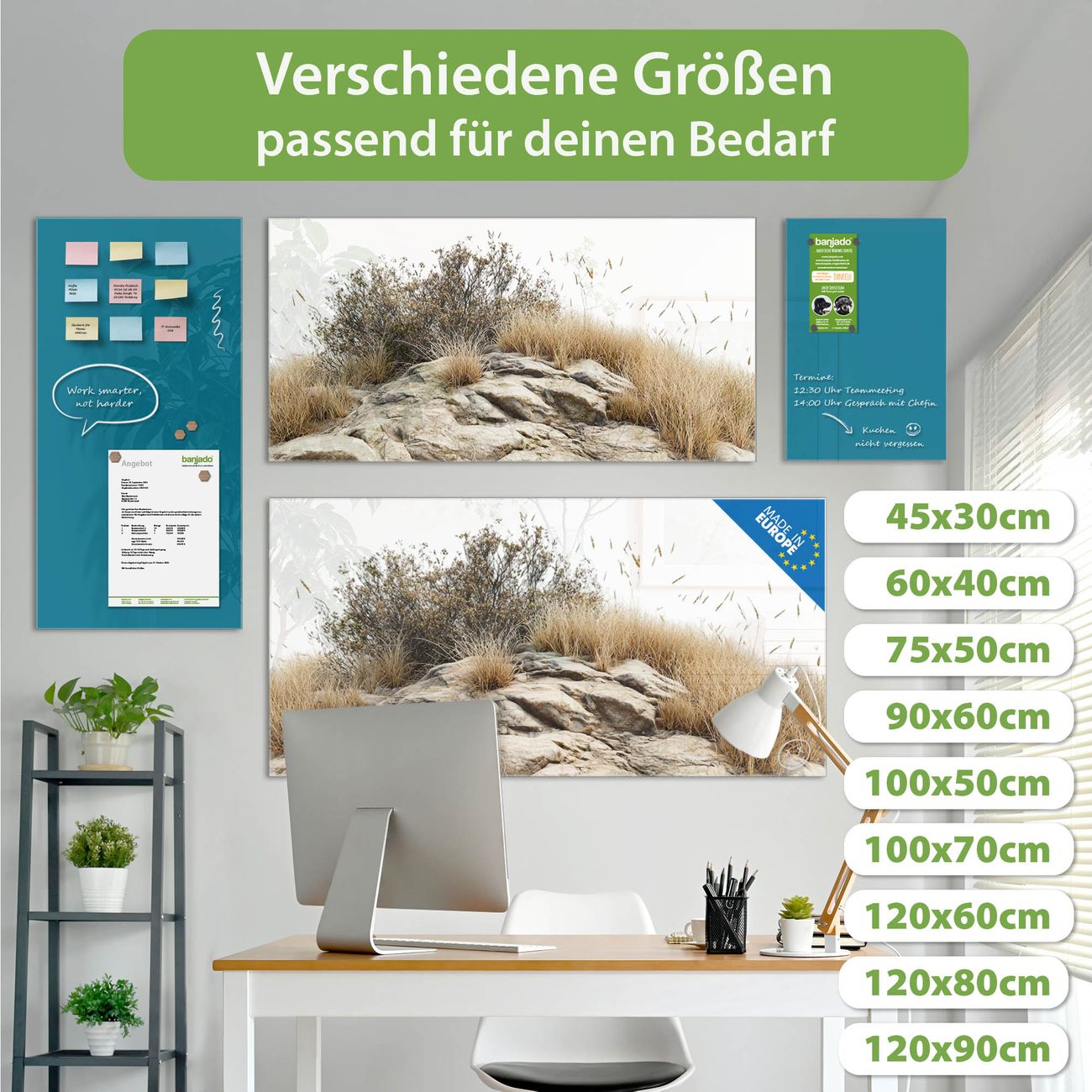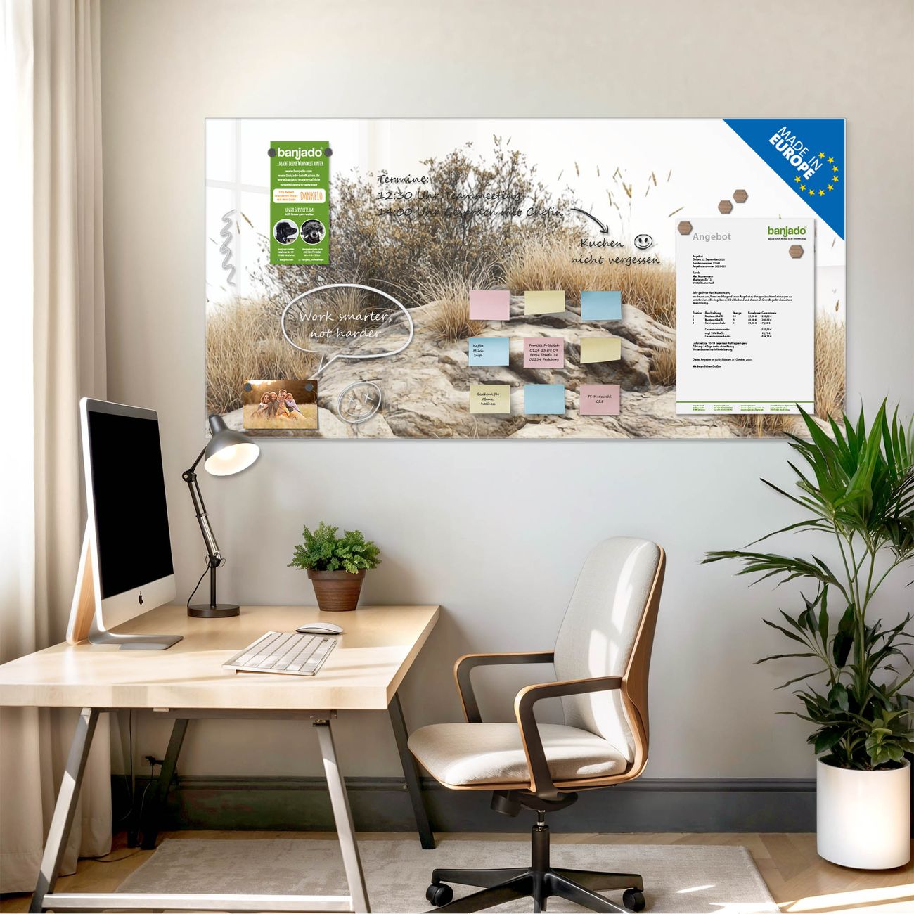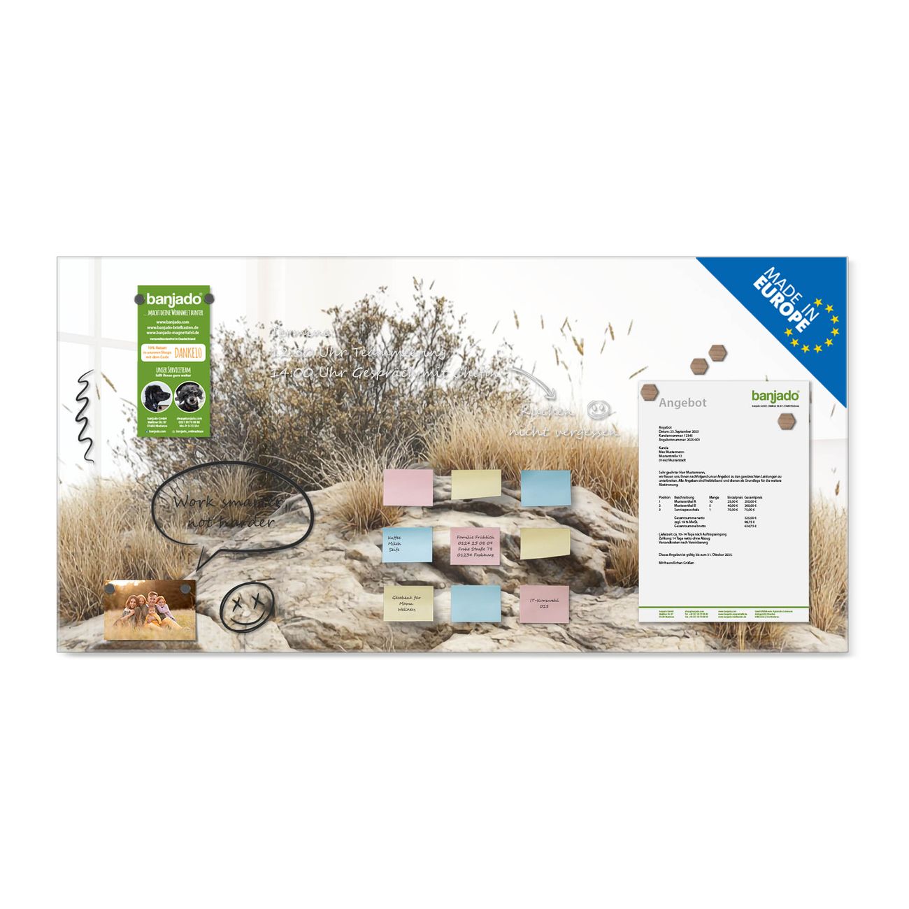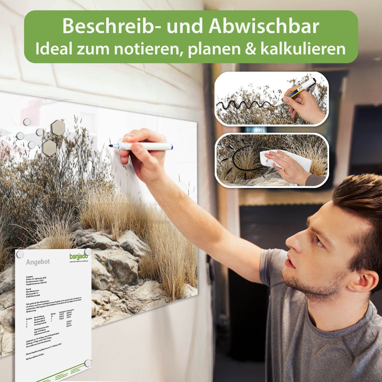 Jede Glas Magnettafel wird in unserer Werkstatt von Hand gefertigt und sorgfältig geprüft. So erhalten Sie ein echtes Qualitätsprodukt, das Funktion und Ästhetik perfekt vereint.?? Warum banjado?