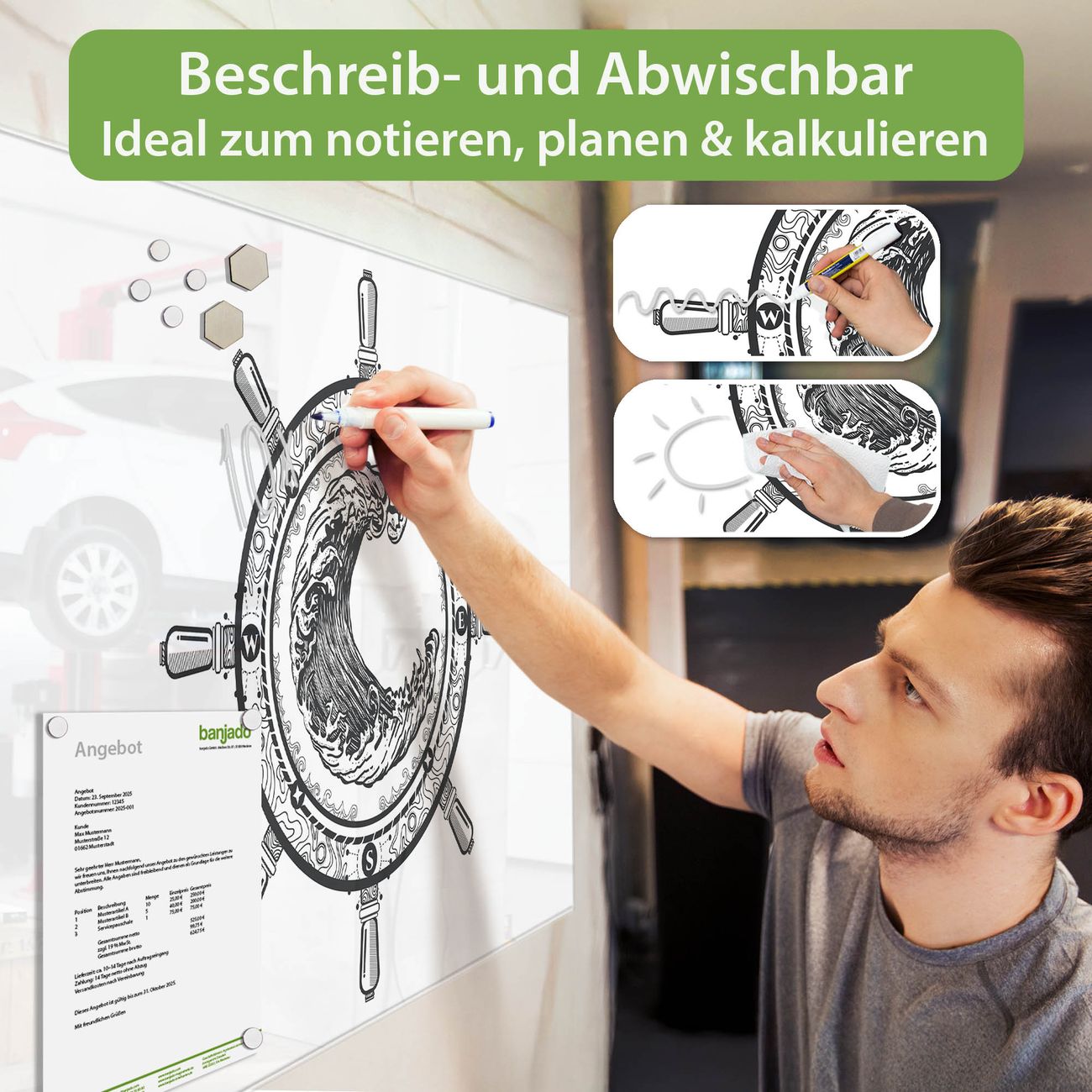 Jede Glas Magnettafel wird in unserer Werkstatt von Hand gefertigt und sorgfältig geprüft. So erhalten Sie ein echtes Qualitätsprodukt, das Funktion und Ästhetik perfekt vereint.?? Warum banjado?