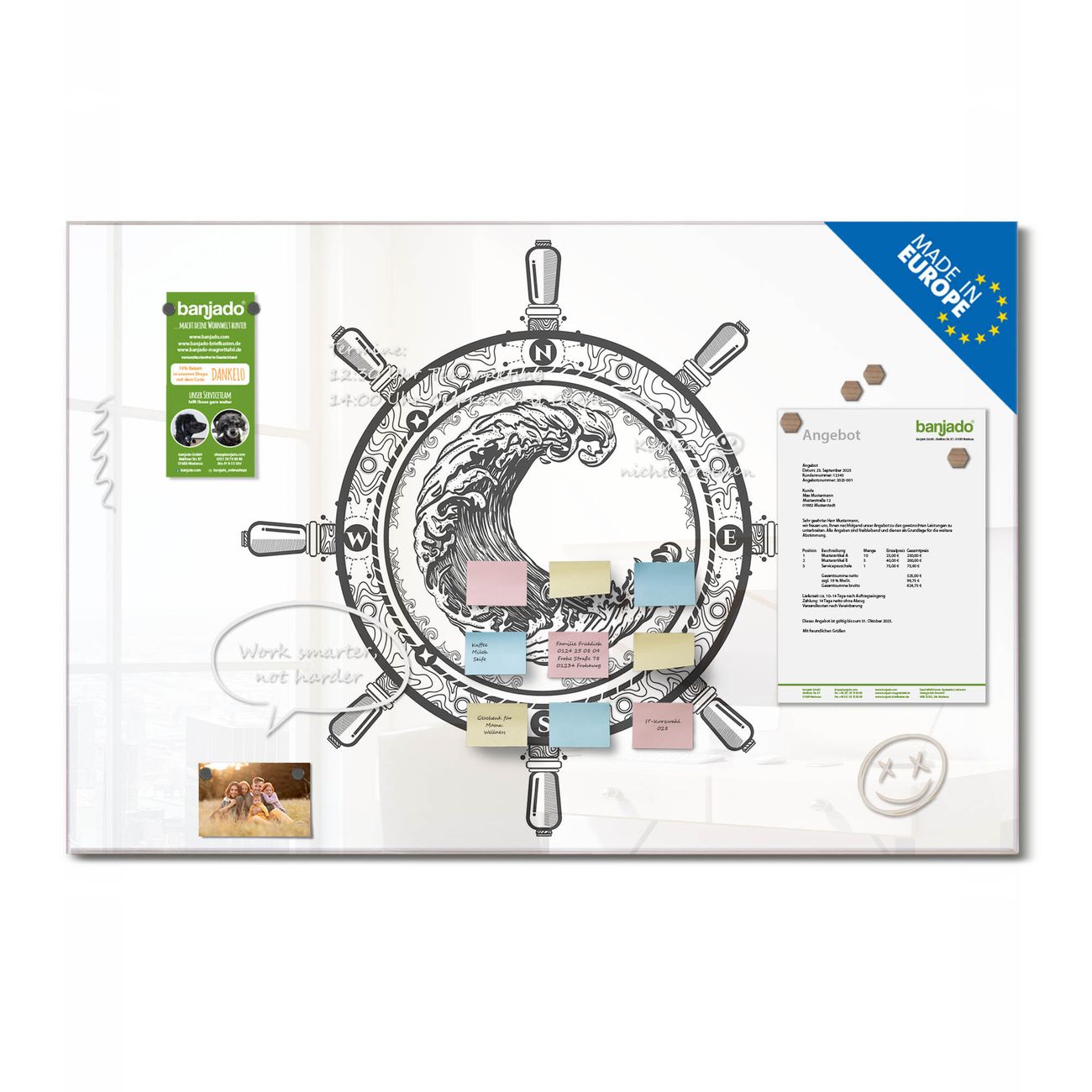 Jede Glas Magnettafel wird in unserer Werkstatt von Hand gefertigt und sorgfältig geprüft. So erhalten Sie ein echtes Qualitätsprodukt, das Funktion und Ästhetik perfekt vereint.?? Warum banjado?