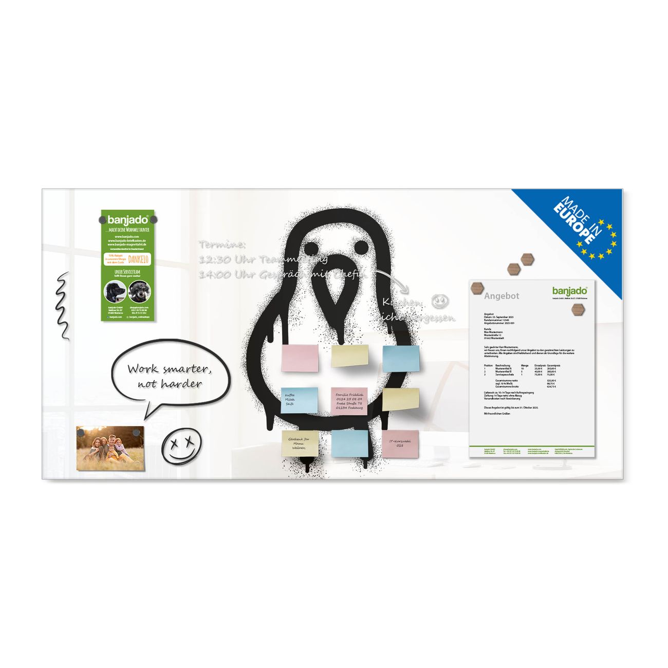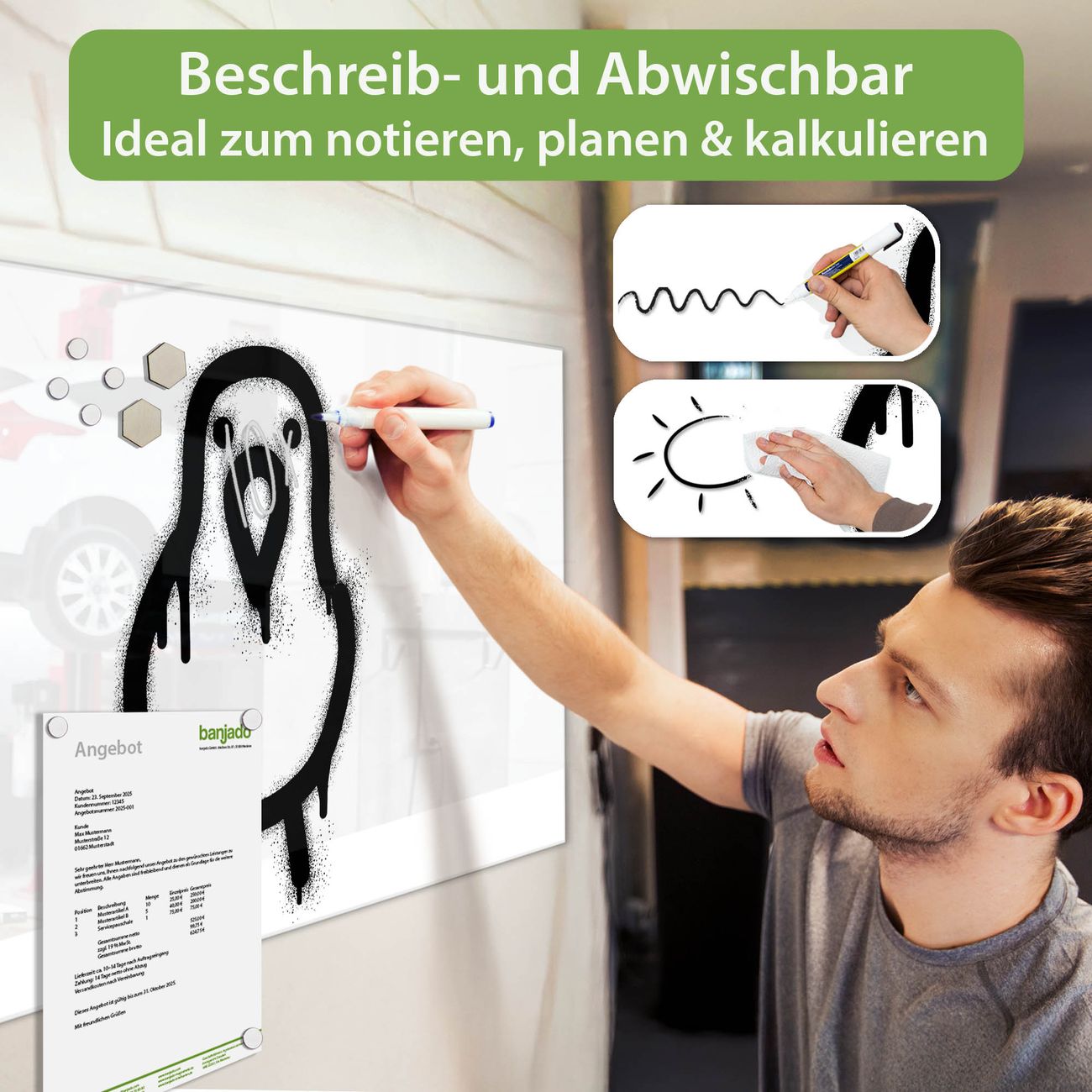Jede Glas Magnettafel wird in unserer Werkstatt von Hand gefertigt und sorgfältig geprüft. So erhalten Sie ein echtes Qualitätsprodukt, das Funktion und Ästhetik perfekt vereint.?? Warum banjado?