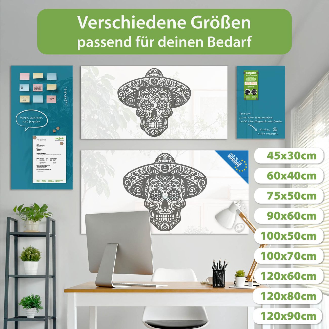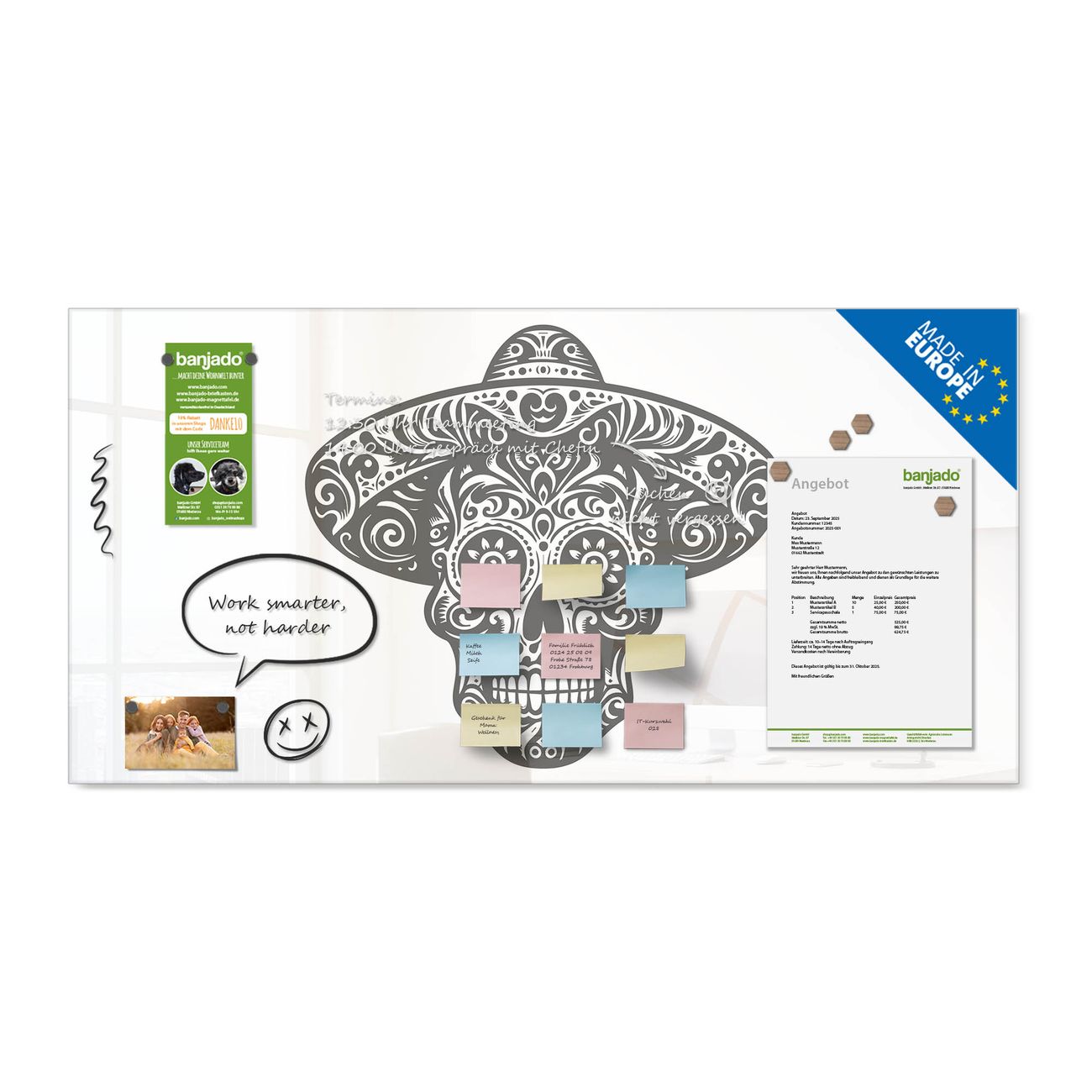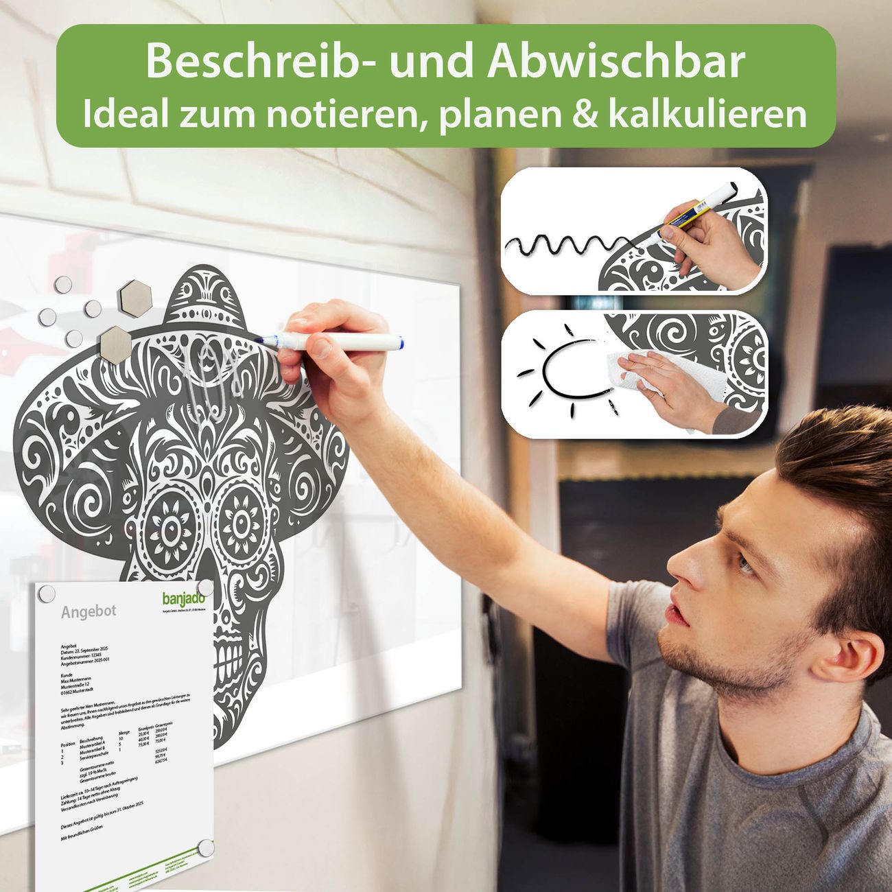 Ein Stück Design, das Ihren Alltag organisiert. Schreiben, heften, inspirieren - alles an einem Ort. Qualität, die man spürt. Montage leicht gemacht. Handwerk mit Herz - veredelt in Sachsen. Einzigartiges Design mit Motiv Motiv Sugar Skull Design Beschreibbare Glasoberfläche, leicht zu reinigen Starke Magnetkraft durch Stahlrückwand Inklusive 4 Neodym-Magneten Flexible Montageoptionen Handveredelt in Sachsen - Qualität, die bleibt