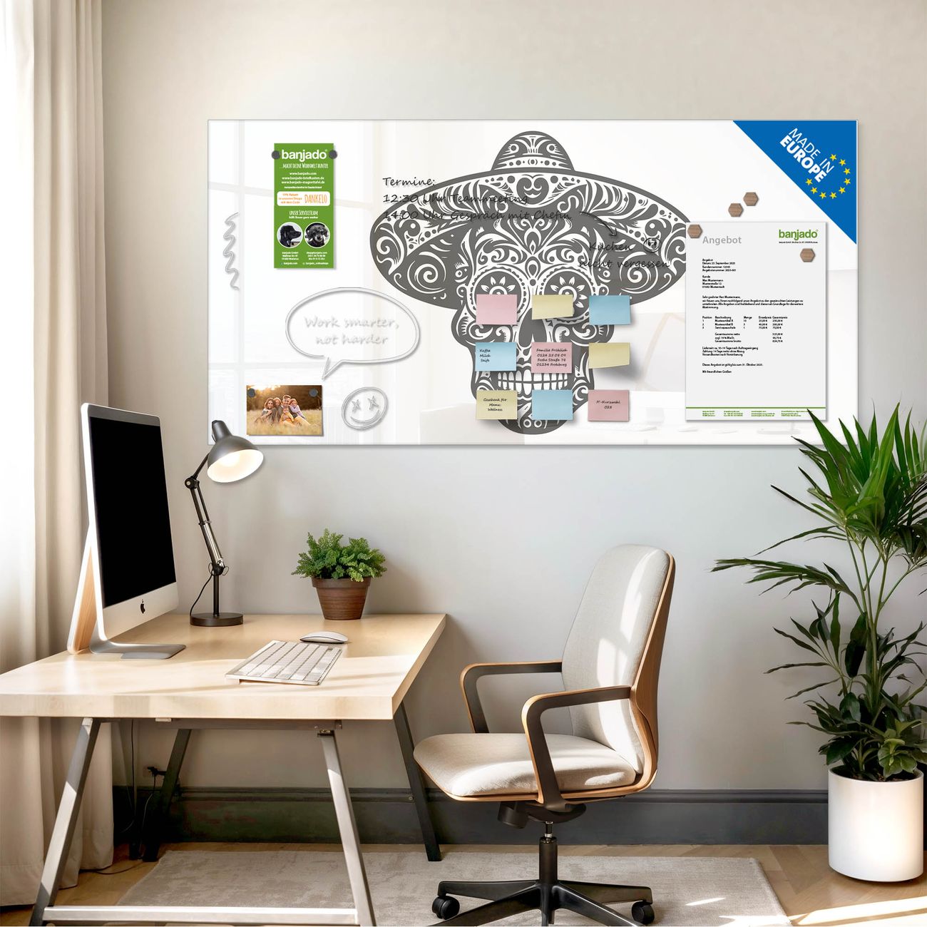 Jede Glas Magnettafel wird in unserer Werkstatt von Hand gefertigt und sorgfältig geprüft. So erhalten Sie ein echtes Qualitätsprodukt, das Funktion und Ästhetik perfekt vereint.?? Warum banjado?