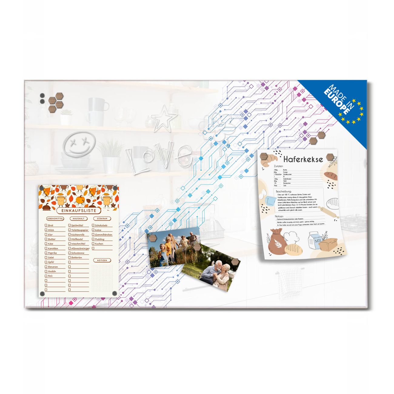 Ein Stück Design, das Ihren Alltag organisiert. Schreiben, heften, inspirieren - alles an einem Ort. Qualität, die man spürt. Montage leicht gemacht. Handwerk mit Herz - veredelt in Sachsen. Einzigartiges Design mit Motiv Motiv Technologiemuster Beschreibbare Glasoberfläche, leicht zu reinigen Starke Magnetkraft durch Stahlrückwand Inklusive 4 Neodym-Magneten Flexible Montageoptionen Handveredelt in Sachsen - Qualität, die bleibt